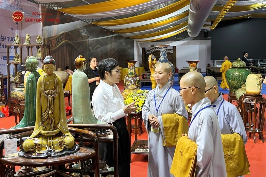 Trong không gian hội chợ, gian hàng của Không Gian Gốm Bát Tràng nổi bật nhờ sự kết hợp hài hòa giữa tính thẩm mỹ và giá trị văn hóa. Những bộ đồ thờ được chế tác tinh xảo, trang nghiêm; các bình hút lộc, tượng decor mang nét nghệ thuật hiện đại; cùng những bộ bát, đĩa, ấm trà gia dụng gần gũi đã mang đến cho khách tham quan một trải nghiệm đa dạng, từ trang trí, tín ngưỡng đến sinh hoạt thường ngày.