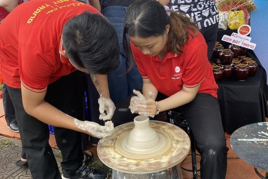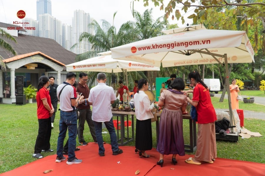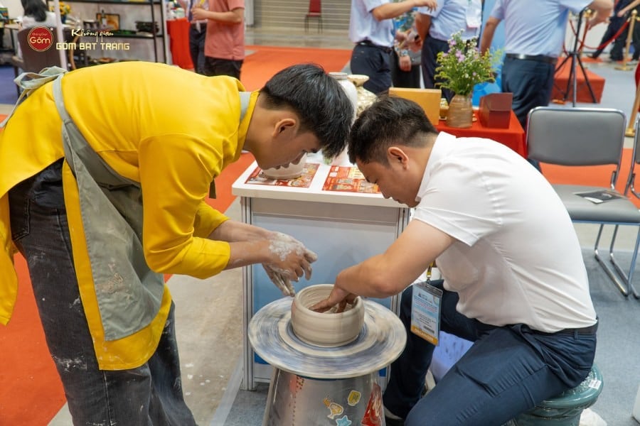 Gian hàng của Không Gian Gốm Bát Tràng không chỉ thu hút khách tham quan bởi sự đa dạng sản phẩm, mà còn bởi trải nghiệm văn hóa mà nó mang lại. Du khách được tận tay nặn gốm, thử sức trên bàn xoay, tô tượng… để hiểu hơn về nghề thủ công đã tồn tại hàng trăm năm. Hoạt động này không chỉ phù hợp với gia đình, trẻ nhỏ, mà còn khiến khách du lịch quốc tế vô cùng thích thú. Nhiều du khách đã coi đó là trải nghiệm đáng nhớ, bên cạnh việc mua sắm sản phẩm gốm làm quà lưu niệm.