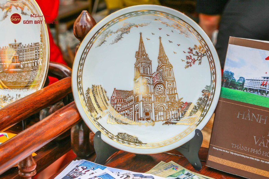 Tác phẩm “Đĩa trưng bày Bưu điện Thành phố – Nhà thờ Đức Bà” không chỉ là một món đồ trang trí, mà còn là cầu nối văn hóa. Hình ảnh Bưu điện Thành phố và Nhà thờ Đức Bà được tái hiện tinh tế trên nền gốm, gợi nhắc đến một TP.HCM vừa cổ kính, vừa hiện đại. Đây cũng là cách Không Gian Gốm Bát Tràng kể câu chuyện về thành phố: nơi giao thoa giữa lịch sử, văn hóa và nhịp sống đương đại. Thông qua sản phẩm này, thương hiệu đã chứng minh rằng gốm Bát Tràng có thể mang hơi thở của thời đại, thích ứng linh hoạt để làm mới hình ảnh làng nghề trong bối cảnh hội nhập.