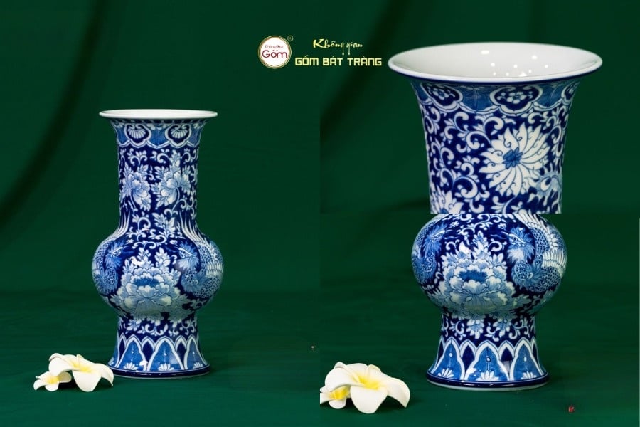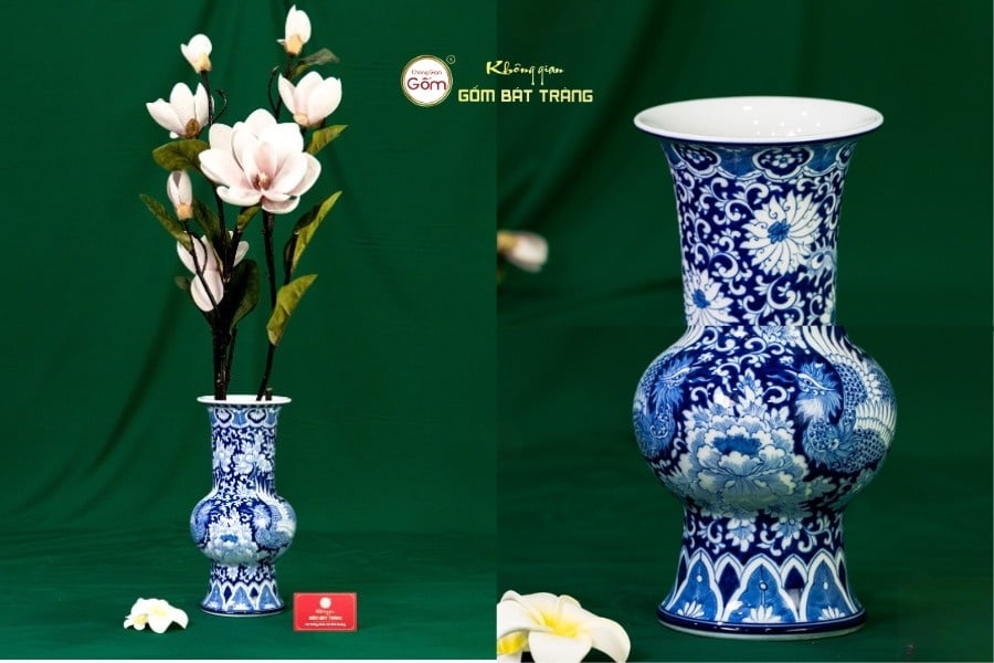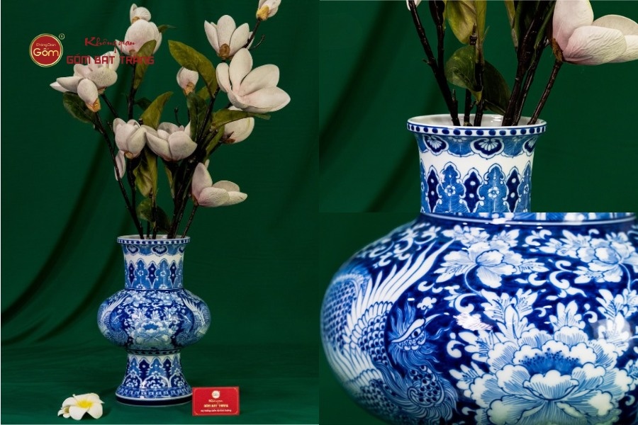 Chiếc bình có dáng vuốt thẳng thanh thoát, phù hợp với phong cách decor hiện đại. Các mảng họa tiết được bố trí khoa học theo dải thân bình, nổi bật với đôi Phụng – biểu tượng của quyền quý và phú cát. Men lam được nghệ nhân xử lý rất đều, cho màu xanh trong trẻo và không bị lem nhoè. Bình dễ phối với nhiều không gian: phòng khách, bàn làm việc hoặc tủ trưng bày, giúp nâng tầm thẩm mỹ của toàn bộ không gian sống.