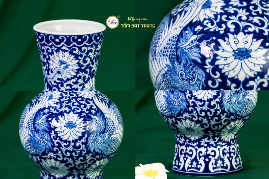 Hoạ tiết được vẽ bằng tay 100%, không qua in ấn, giúp mỗi chiếc lọ trở thành một bản thể độc nhất. Dòng men lam đặc trưng mang đến vẻ đẹp cổ điển, sang trọng, trong khi các họa tiết tứ quý, song phượng, hoa sen, ngư khánh… thể hiện thông điệp phong thủy tốt lành, cầu mong bình an – phú quý – thịnh vượng.
