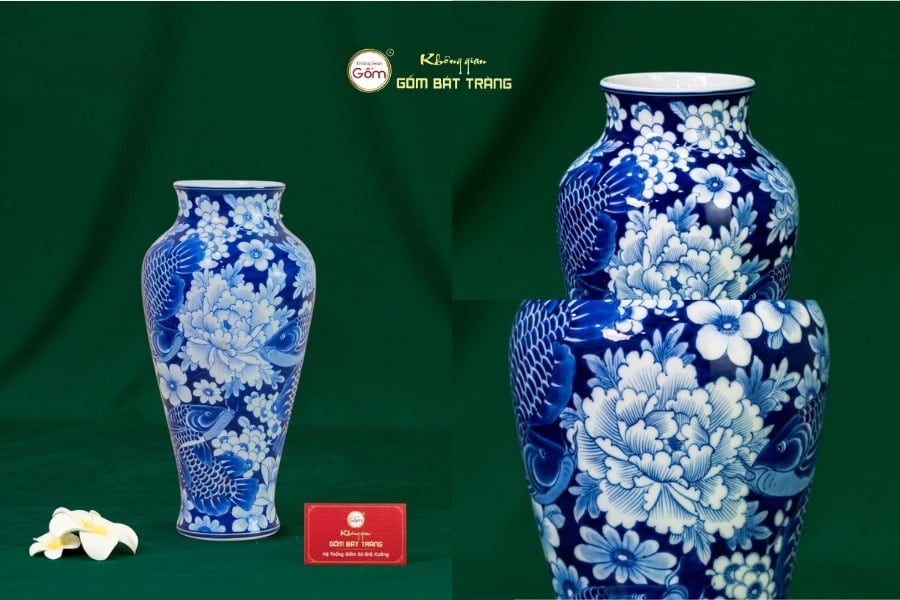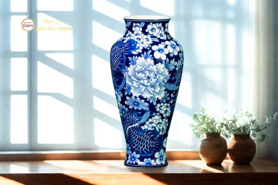Họa tiết Ngư Tụ tượng trưng cho sự sum vầy, tài lộc và hanh thông. Tông lam ngọc mang lại cảm giác thanh khiết, phù hợp với những không gian trang nhã. Mỗi nét vẽ cá chép đều được thực hiện tỉ mỉ, tạo hiệu ứng chuyển động mềm mại như đang bơi lượn trong làn nước. Dáng bình cao, miệng nở giúp cắm hoa rất đẹp, đồng thời cũng có thể trưng như vật phẩm phong thủy cầu bình an – sung túc.