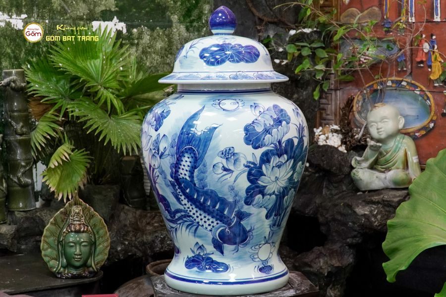 Họa tiết cá chép và hoa sen tượng trưng cho sự kiên trì, thanh cao và thăng tiến. Sắc lam trầm sâu làm nổi bật nét sống động của từng đường nét vẽ tay, phù hợp cho việc ngâm rượu quý hoặc trưng bày phong thủy trong phòng khách. Bình choé thoạt nhìn có vẻ đơn điệu nhưng lại mang ý nghĩa sâu sắc. Bình có nhiều dung tích với kích thước lớn nhỏ đa dạng, đảm bảo đáp ứng nhu cầu của khách hàng.
