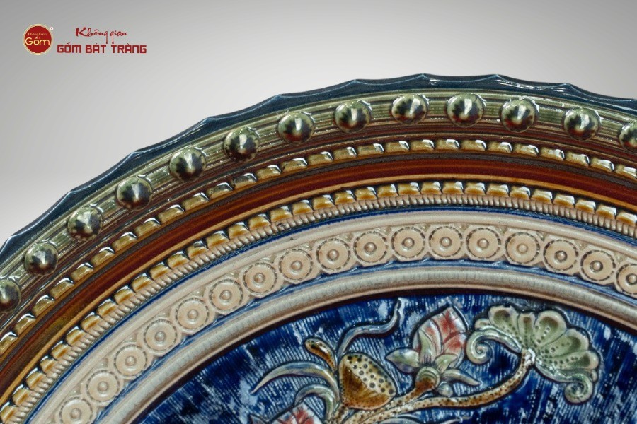 Họa tiết trên đĩa cảnh Bát Tràng là điểm nhấn thể hiện đẳng cấp của nghệ thuật thủ công. Từ những đường vẽ men lam cổ điển đến các họa tiết đắp nổi công phu, tất cả đều được thể hiện sống động và hài hòa. Mỗi hoa văn đều mang một thông điệp riêng: hoa sen biểu trưng cho thanh khiết và cát tường, cá chép tượng trưng cho sự vượt khó, hay hình ảnh kỳ lân – linh thú của phúc lộc và quyền uy.