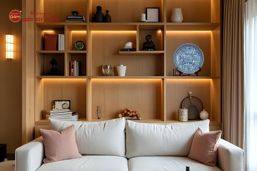 Đĩa có thể đặt đĩa lên kệ gỗ, tủ trang trí hoặc treo tường ngay phía sau bộ sofa. Các mẫu đĩa như “Liên Hoa Cát Tường” hay “Cá Chép Hoa Sen” vừa mang đến cảm giác thanh khiết, lại tượng trưng cho tài lộc và sự thăng tiến.