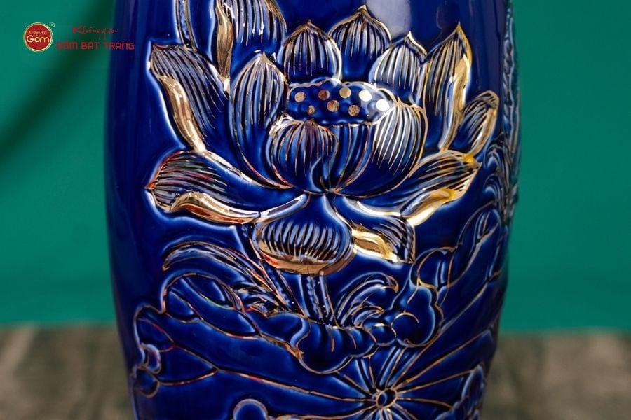 Hoa sen khắc nổi vẽ vàng trên bề mặt lọ hoa