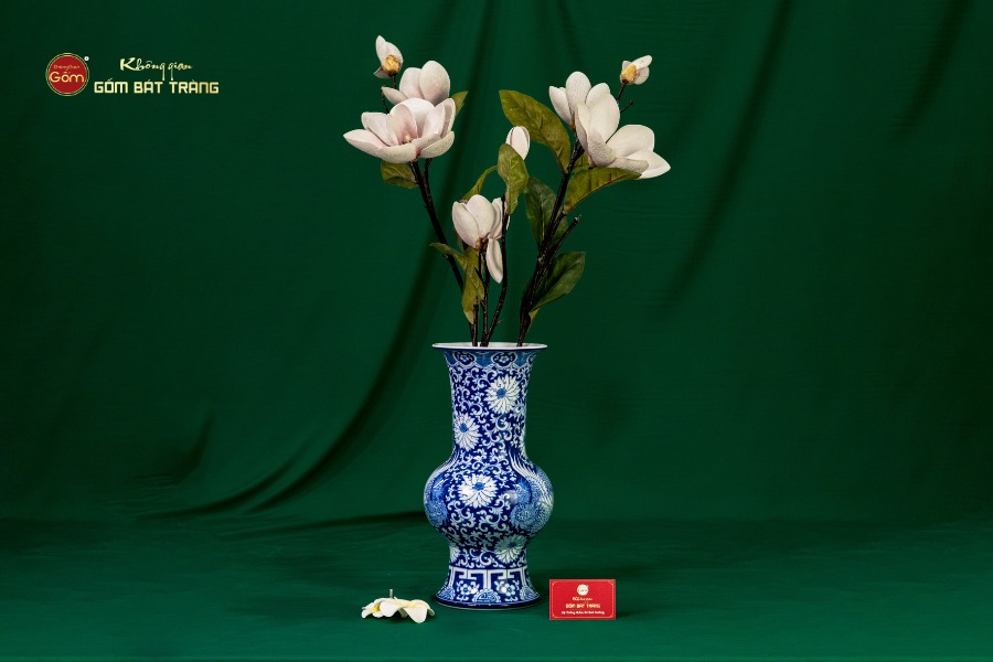 Mỗi chiếc lọ được tạo hình hoàn toàn thủ công bởi đôi tay người thợ gốm, từ khâu tạo hình, phơi, tráng men cho đến khi vẽ họa tiết. Trên nền men lam mát mắt, những đường cọ mềm mại khắc họa hình ảnh hoa sen, cúc, mai, đào, trúc...những biểu tượng vừa quen thuộc, vừa mang ý nghĩa sâu sắc về cốt cách thanh cao, kiên nhẫn và vẻ đẹp tự nhiên của người phụ nữ Việt.