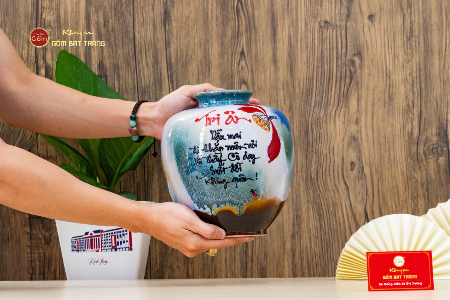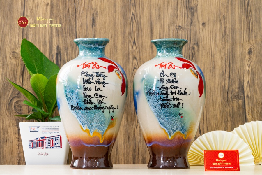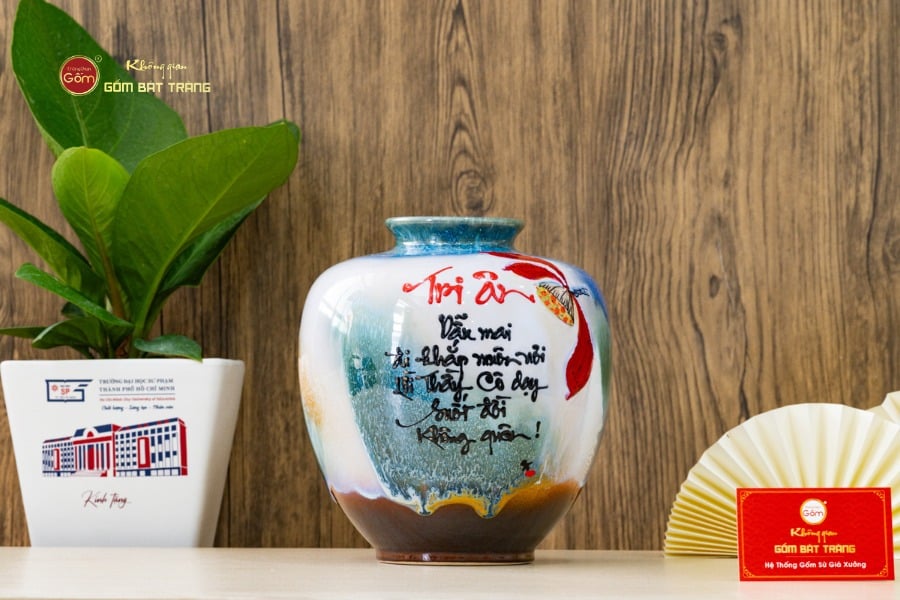 Lọ hoa men chảy là một trong những dòng gốm trang trí được yêu thích nhất hiện nay nhờ hiệu ứng men chuyển màu độc đáo và vẻ đẹp mềm mại của lớp men loang tự nhiên. Khi kết hợp cùng những dòng thư pháp Việt, sản phẩm không chỉ mang giá trị thẩm mỹ cao mà còn trở thành một tác phẩm nghệ thuật mang ý nghĩa tri ân sâu sắc, phù hợp để tặng thầy cô, đối tác, người thân hoặc dùng làm quà tặng doanh nghiệp.