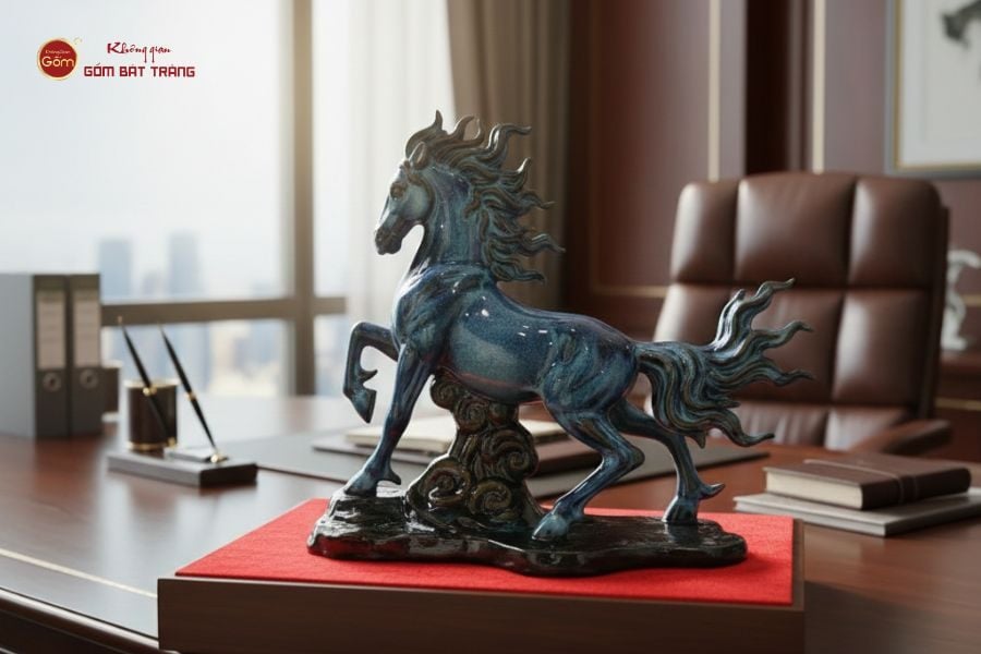 Chất liệu cũng là yếu tố không thể bỏ qua. Tượng ngựa gốm sứ Bát Tràng được đánh giá cao nhờ xương gốm chắc, nước men bền màu và khả năng lưu giữ năng lượng phong thủy ổn định. Các gam màu như xanh lục, xanh lam, vàng nâu, trắng ngà hay men hỏa biến đều phù hợp với không khí Tết và năm Bính Ngọ, vừa nổi bật vừa hài hòa với nhiều phong cách nội thất.