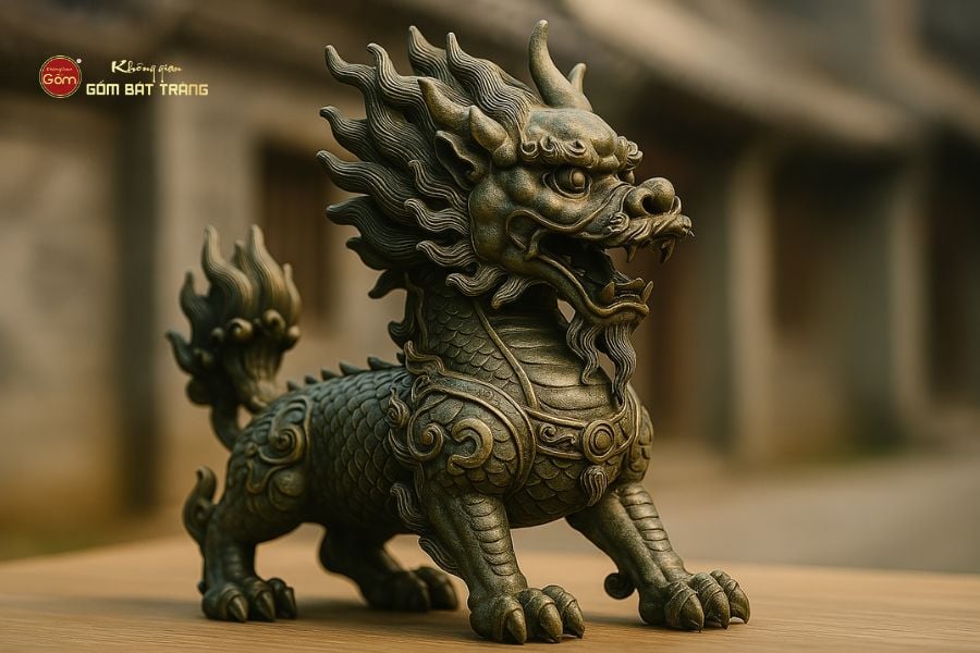 Thần thái kỳ lân oai vệ nhưng hiền hòa, thân phủ vảy mây uốn lượn, bộ bờm xoáy cuộn thể hiện thần khí.