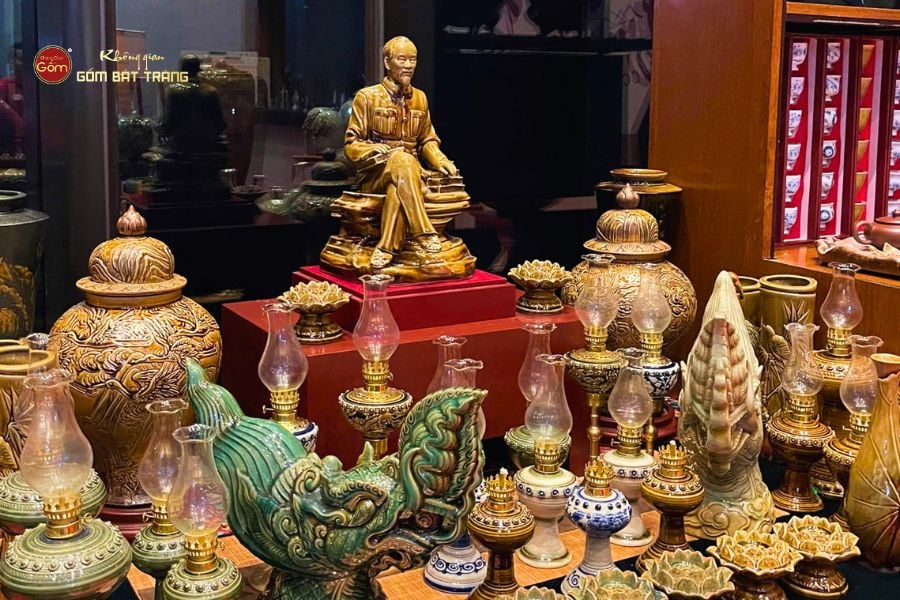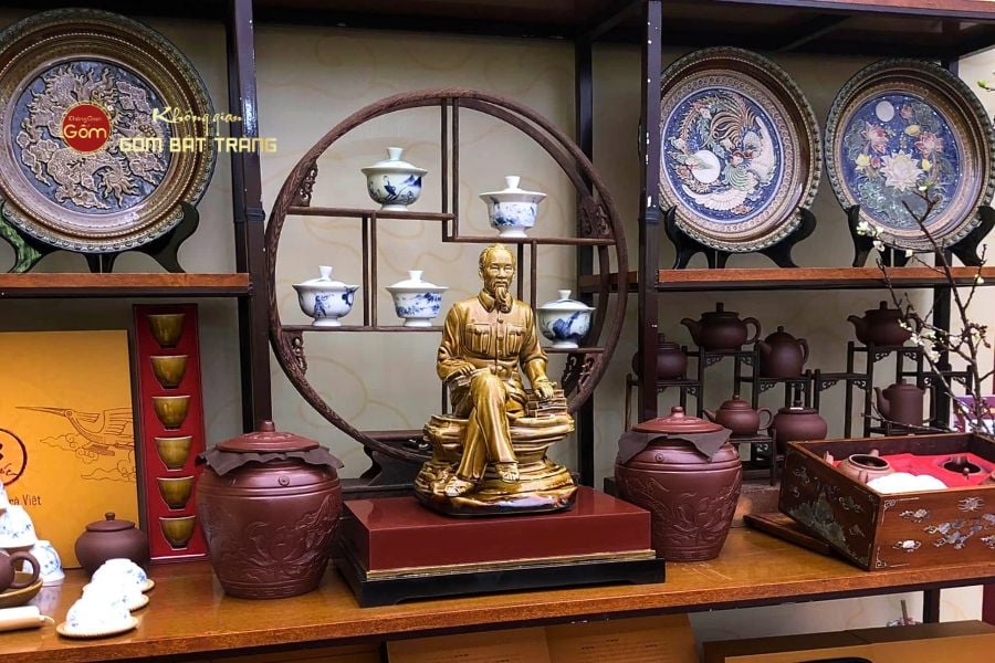Tượng Bác Hồ ngồi bệ đá là một trong những tác phẩm nghệ thuật đặc sắc, được chế tác thủ công từ làng nghề gốm sứ Bát Tràng. Hình ảnh Bác Hồ ngồi ung dung, giản dị trên bệ đá không chỉ khắc họa được thần thái minh triết, nhân hậu mà còn gợi nhắc đến phong cách sống mộc mạc, gần gũi của Người, một vị lãnh tụ vĩ đại nhưng luôn hòa mình với nhân dân.