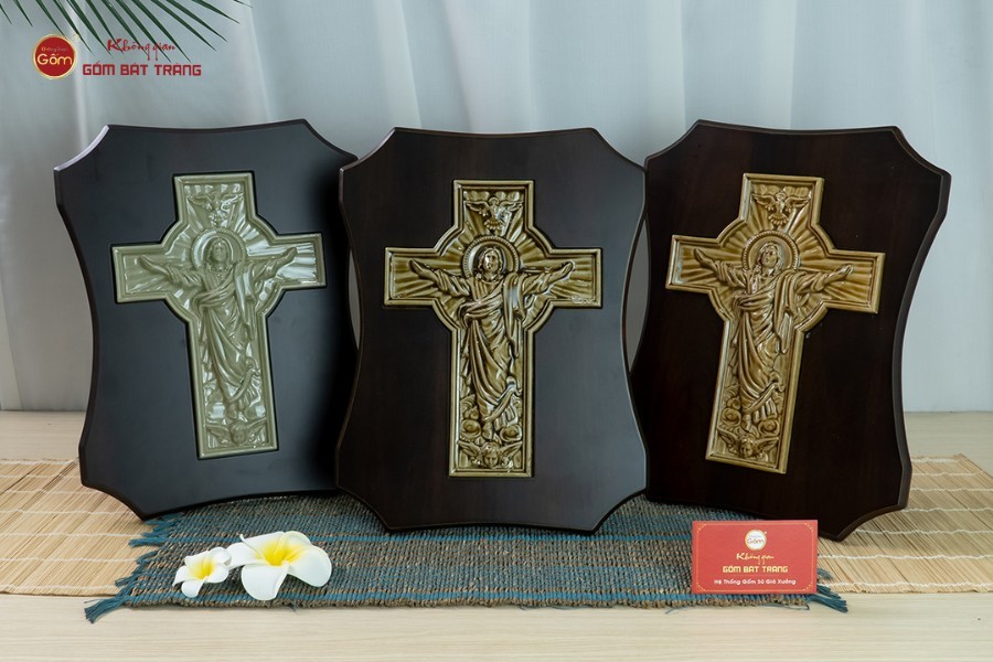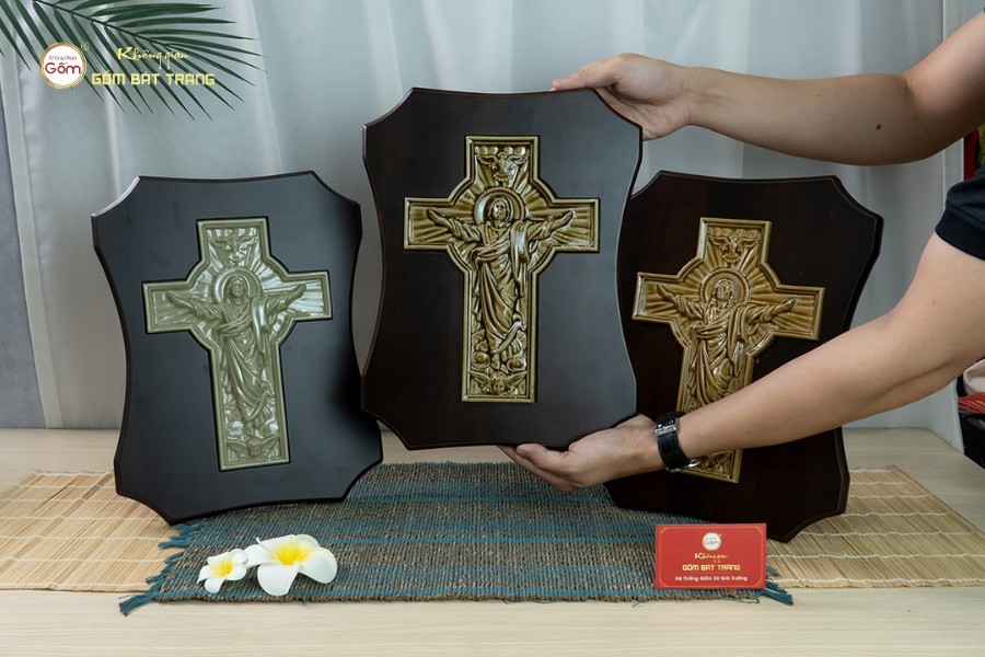 Đây là biểu tượng thiêng liêng nhất của đạo Công Giáo, tượng trưng cho sự hi sinh và lòng nhân từ của Chúa Giê-su. Mẫu tranh gốm sứ được thiết kế với đường nét mạnh mẽ, tông màu men xanh trang nhã, nền gỗ sẫm tạo nên tổng thể hài hòa. Khi đặt trong phòng khách hoặc bàn thờ nhỏ, bức tranh không chỉ mang lại cảm giác bình an mà còn giúp nhắc nhở mỗi người luôn sống đúng với đức tin của mình.