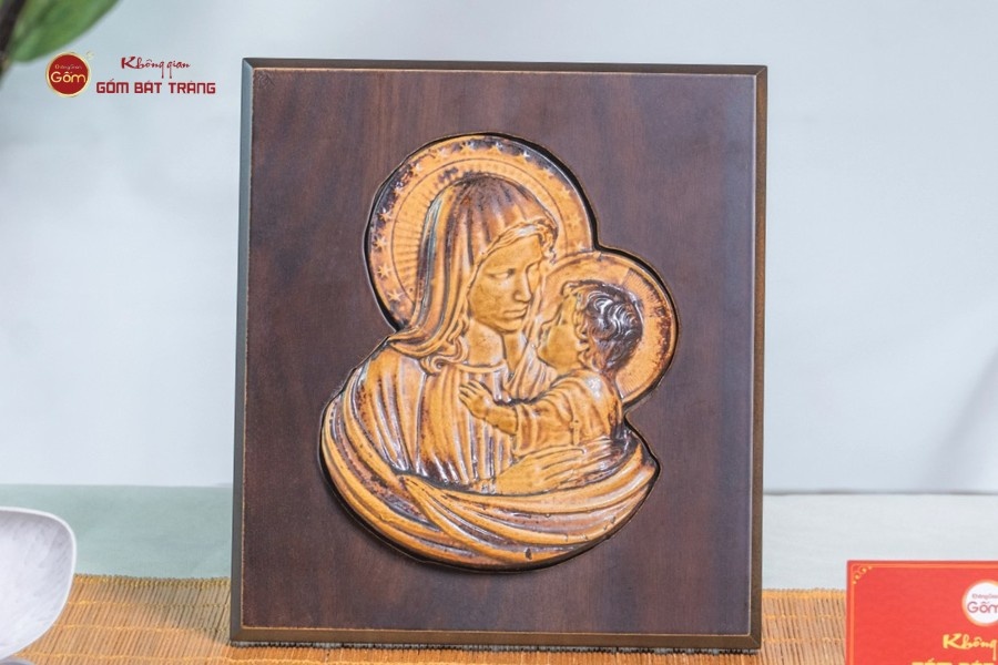 Bức tranh thể hiện hình ảnh Đức Mẹ hiền từ âu yếm bế Chúa Hài Đồng, tượng trưng cho tình mẫu tử thiêng liêng và sự bảo hộ. Màu men vàng ánh nhẹ cùng nét đắp nổi mềm mại tôn lên vẻ dịu dàng, nhân ái. Khi trưng bày trong không gian thờ tự, văn phòng hoặc phòng làm việc, tranh giúp lan tỏa năng lượng bình an và khơi gợi lòng bao dung. Đây cũng là món quà ý nghĩa dành cho những người mẹ, người phụ nữ trong gia đình Công Giáo.