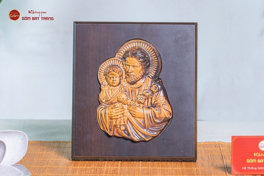 Hình ảnh Thánh Giuse bế Chúa Hài Đồng tượng trưng cho tình phụ tử và trách nhiệm thiêng liêng trong gia đình. Bức tranh gốm sứ được chế tác tỉ mỉ, men vàng ánh sáng hòa cùng nền đen sang trọng, thể hiện rõ nét sự ấm áp và bền chặt trong tình thân. Tranh thích hợp để treo ở phòng khách hoặc khu vực thờ, vừa thể hiện lòng thành kính, vừa nhắc nhở về giá trị của gia đình và tình yêu thương.