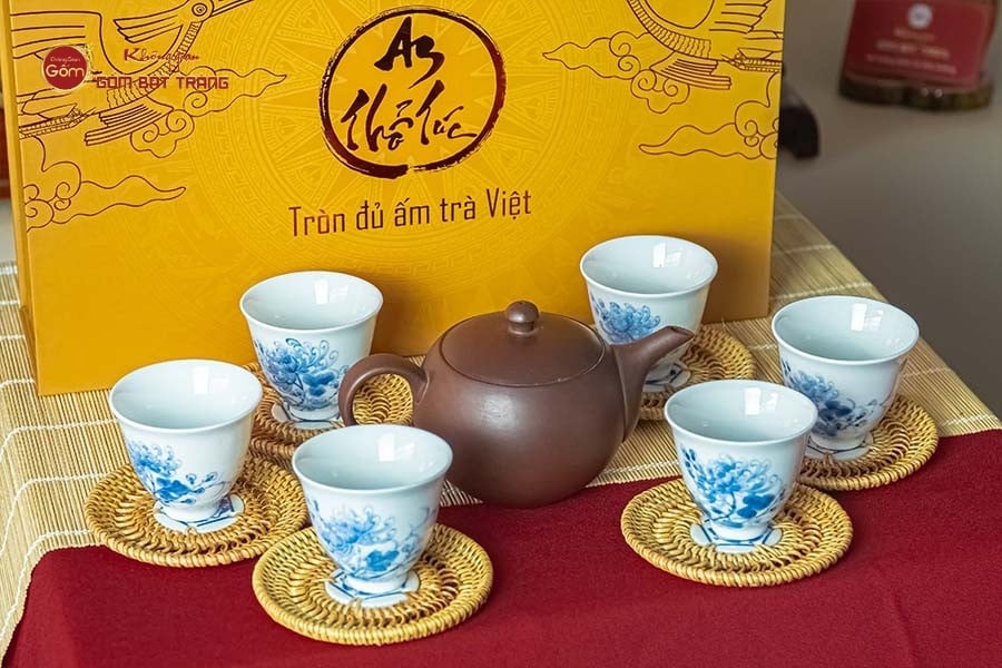 Ấm Trà An Thổ Túc và chén sứ là sự tiếp nối của tinh hoa làm ấm của cha ông cùng sự kết hợp quá trình khai thác và chế biến đất kỳ công và quá trình chế tác ấm thủ công tỉ mỉ kỹ lưỡng từng chi tiết đường nét. Chén sứ trắng thấu quang giúp quan sát màu nước trà dễ dàng hơn, đồng thời chất sứ cũng hợp với nước trà đen. Chén cao dùng khi thưởng trà vào mùa đông và chén sứ thấp dùng vào mùa hè.