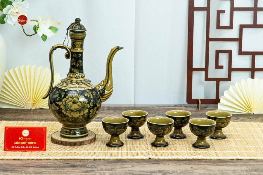 Sắc men đen sâu thẳm kết hợp họa tiết hoa phù dung vàng óng là điểm nhấn ấn tượng của dòng sản phẩm này. Phù dung vốn là loài hoa tượng trưng cho vẻ đẹp thanh cao, kiêu sa. Khi được thể hiện trên nền men đen huyền bí, bộ bình rượu mang đến cảm giác quyền quý, đẳng cấp, rất thích hợp cho không gian tiếp khách sang trọng hay dùng làm quà biếu tặng đối tác.
