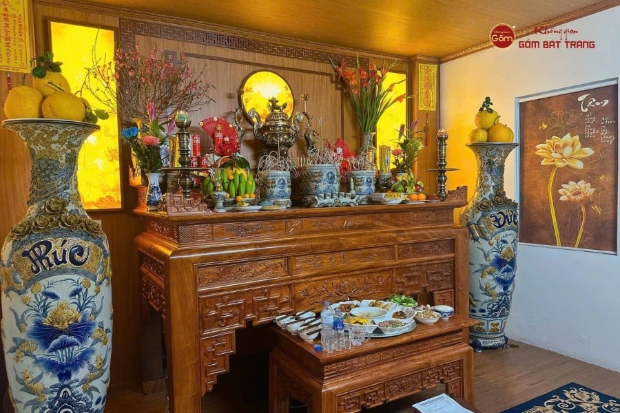 Bộ đôi lộc bình Phúc Đức gốm Bát Tràng trưng bày hai bên phòng thờ
