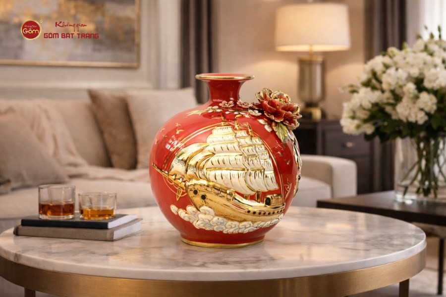Hình ảnh con thuyền buồm no gió vươn ra biển lớn là biểu tượng của sự thuận lợi, thành công, mọi việc hanh thông, "tiền vào như nước". Họa tiết được vẽ vàng 24K, làm tăng thêm sự sang trọng và giá trị của sản phẩm. Khi kết hợp trên nền men đỏ, mẫu bình này giúp gia tăng năng lượng tích cực và khơi mở cơ hội. Việc sử dụng vàng 24K để vẽ họa tiết không chỉ làm tăng giá trị vật chất mà còn là sự khẳng định về trình độ chế tác tinh xảo của nghệ nhân Bát Tràng.