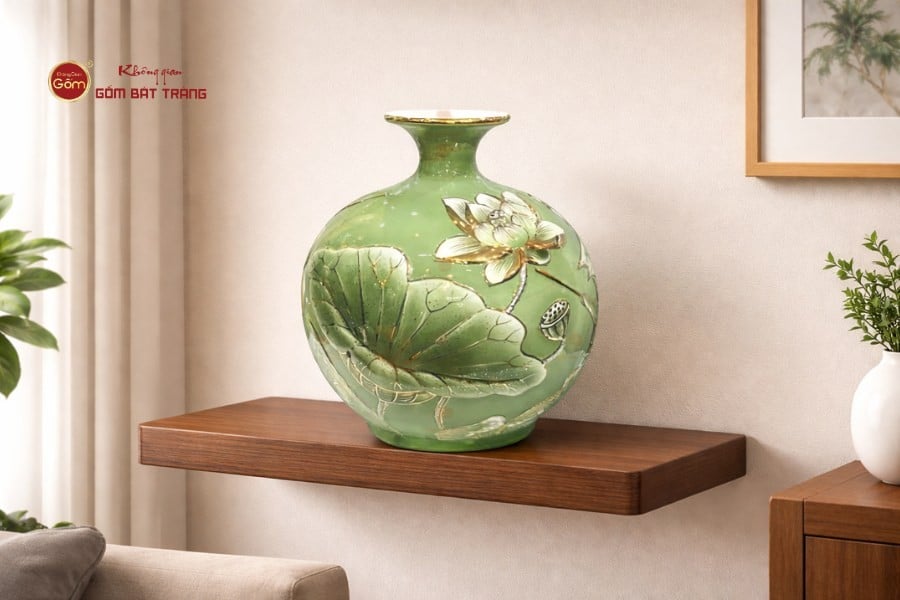 - Nên đặt bình ở nơi khô ráo, tránh ánh nắng trực tiếp chiếu vào trong thời gian dài để hạn chế ảnh hưởng đến lớp men và chi tiết vàng. Khi vệ sinh, sử dụng khăn mềm khô hoặc hơi ẩm lau nhẹ bề mặt, tránh dùng chất tẩy rửa mạnh.