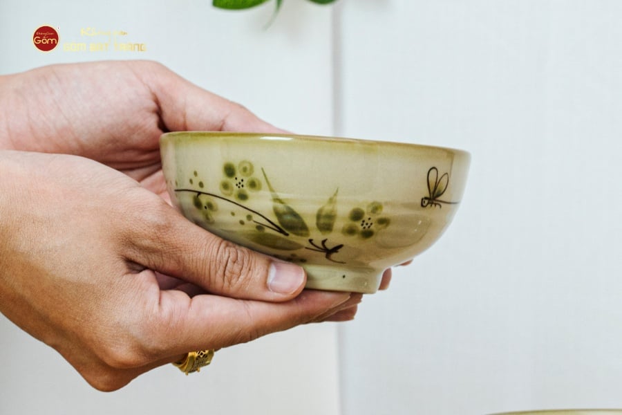 Bát Cơm Hoa Đào Chuồn là vật dụng tiện lợi trên bàn ăn và khu vực bếp nấu ăn. Bát cơm làm từ đất sét chứa hàm lượng cao lanh cao nên thành phẩm cho ra chất sứ cứng cáp và bền chắc. So với các sản phẩm làm từ chất liệu khác thì bát cơm từ chất gốm sứ có bộ bền, cứng và an toàn với sức khỏe hơn. Cùng với sự kết hợp nhẹ nhàng giữa men xanh rêu và các họa tiết. Họa tiết và nước men tạo nên hiệu ứng thẩm mỹ độc đáo, đem lại cho không gian ẩm thực cảm giác trầm ấm, nhẹ nhàng và hiện đại.