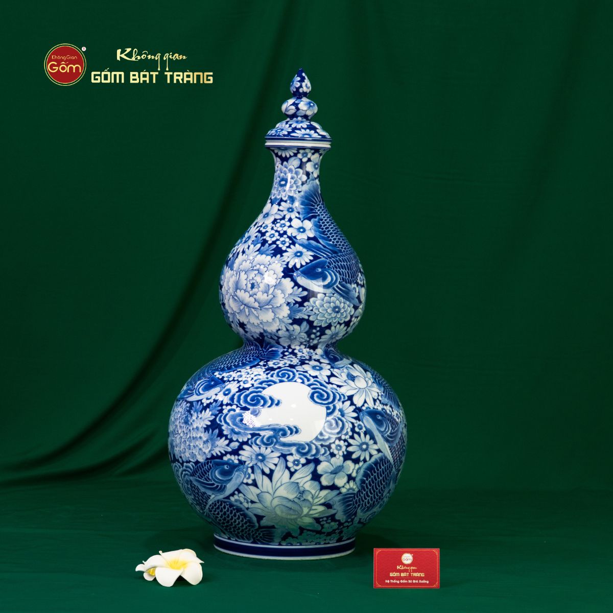 Họa tiết cá chép, hoa sen nở rộ mang ý nghĩa tụ hội điều lành – tất cả đều được vẽ tay bởi nghệ nhân dày dạn kinh nghiệm, tạo nên một bức tranh gốm sống động, giàu ý nghĩa. Sản phẩm với dáng hồ lô phong thủy, thiết kế thân phình – cổ thon đặc trưng, không chỉ đẹp về mặt hình khối mà còn giúp thu hút và giữ lại khí tốt, tài lộc cho gia đình.