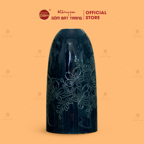 Điểm nhấn của sản phẩm nằm ở lớp men tráng màu xanh sẫm mang chiều sâu thị giác, kết hợp cùng kỹ thuật khắc hoa lá trực tiếp trên thân bình. Những đường khắc mềm mại, uyển chuyển, đan xen tự nhiên như họa tiết lá cây đang lan tỏa, tạo hiệu ứng nổi – chìm rõ ràng khi ánh sáng chiếu vào bề mặt men. Nhờ đó, bình hoa không chỉ đẹp ở hình khối mà còn thu hút ở từng chi tiết chạm khắc thủ công.
