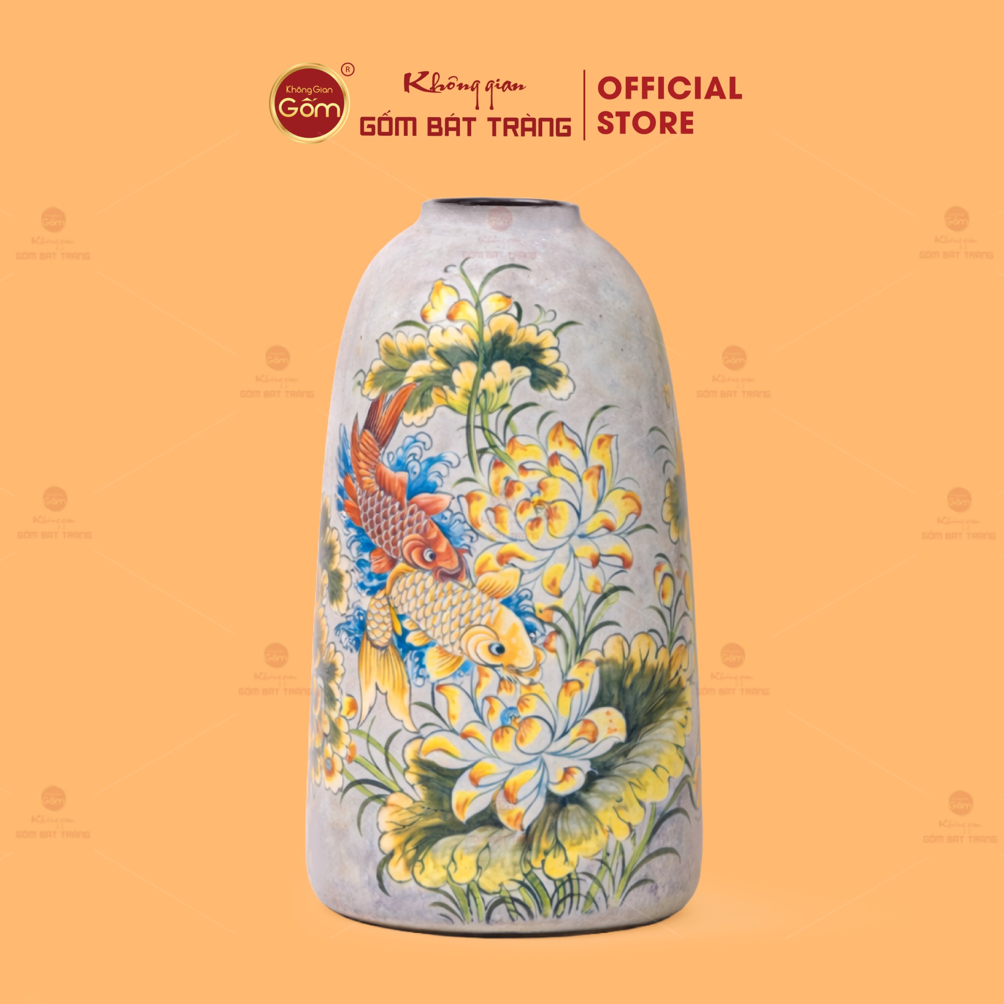 Mỗi chiếc bình là một tác phẩm nghệ thuật được vẽ tay tỉ mỉ bởi các nghệ nhân Bát Tràng. Hình ảnh hoa sen – biểu tượng của sự thuần khiết, thanh cao – kết hợp cùng cá chép – tượng trưng cho ý chí vươn lên, tài lộc và thành công – được thể hiện sinh động, sắc nét và đầy thần thái. Những đường nét mềm mại, màu sắc hài hòa tạo nên một bức tranh sống động trên nền men sáng.