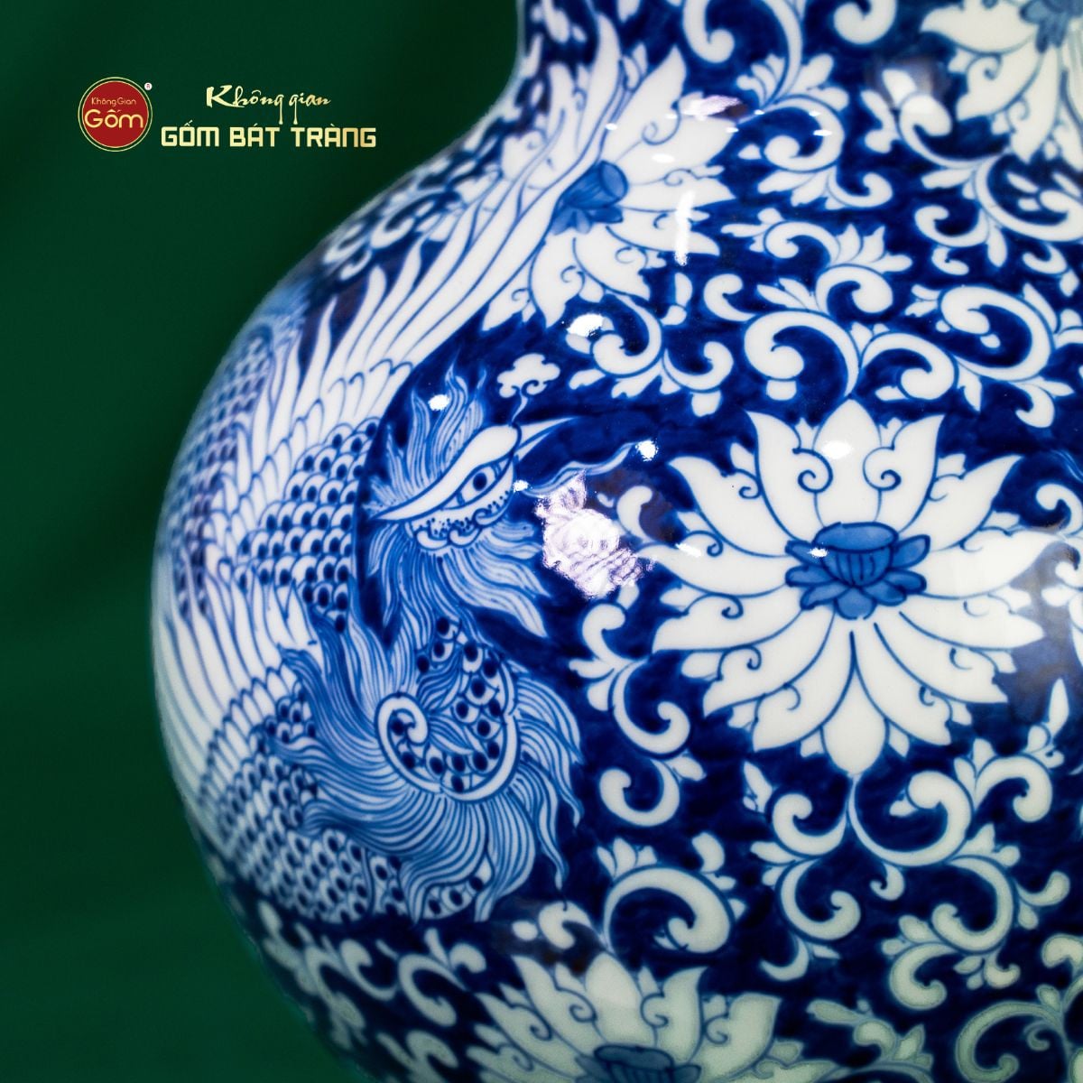 Trên nền men lam là hình ảnh đôi chim phượng đối xứng, vươn cánh giữa những đóa hoa lớn được bố trí cách điệu. Chim phượng – biểu tượng của sự cao quý, quyền lực và trường thọ – khi sánh đôi mang ngụ ý sum vầy, hạnh phúc viên mãn. Các họa tiết hoa mẫu đơn, hoa cúc xen kẽ đại diện cho phú quý, may mắn và sự trường tồn, được khắc họa sắc sảo bằng nét vẽ tay truyền thống, không khuôn rập, tạo nên vẻ đẹp duy nhất không lặp lại.