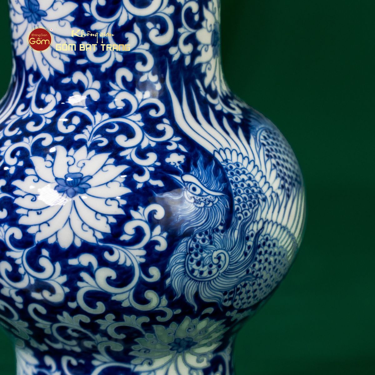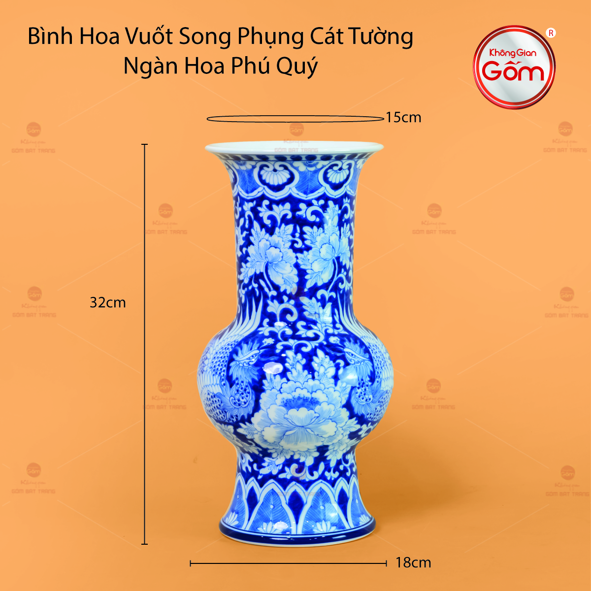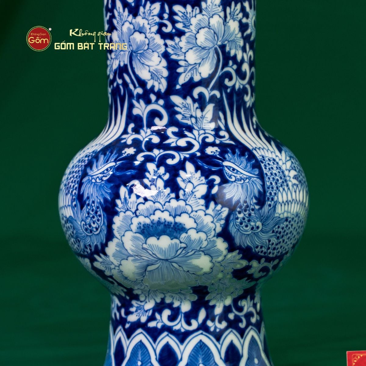 Chiếc bình cao khoảng 32cm, mang dáng vuốt tay cổ điển với thân phình tròn, cổ thon và miệng loe nhẹ, tạo cảm giác thanh thoát, sang trọng. Toàn bộ bề mặt được phủ men lam truyền thống, nổi bật với họa tiết song phụng (cặp chim phượng hoàng) bay lượn giữa ngàn hoa. Các nghệ nhân Bát Tràng vẽ tay từng chi tiết, từ cánh chim mềm mại đến những đóa hoa mẫu đơn, hoa cúc xen kẽ, tạo nên tổng thể hài hòa, sống động. Bình không chỉ là tác phẩm nghệ thuật mà còn là biểu tượng phú quý, hạnh phúc, làm nổi bật không gian sống.