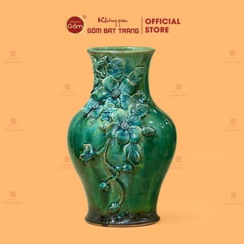 Không rực rỡ sắc màu, không cầu kỳ kiểu dáng – Bình Hoa Vuốt Tay Đắp Nổi Hoa vẫn đủ sức tạo nên điểm nhấn bằng chính vẻ đẹp mộc mạc, tự nhiên và kỹ thuật thủ công tinh xảo. Thân bình dáng tròn phình, cổ thắt nhẹ, miệng loe mềm mại như đóa hoa đang nở. Nổi bật trên nền men xanh rêu (men lục bảo) là họa tiết hoa được đắp nổi thủ công. Từng cánh hoa, từng nụ nở đều mang dấu ấn bàn tay nghệ nhân, sống động như đang lay động theo làn gió nhẹ.
