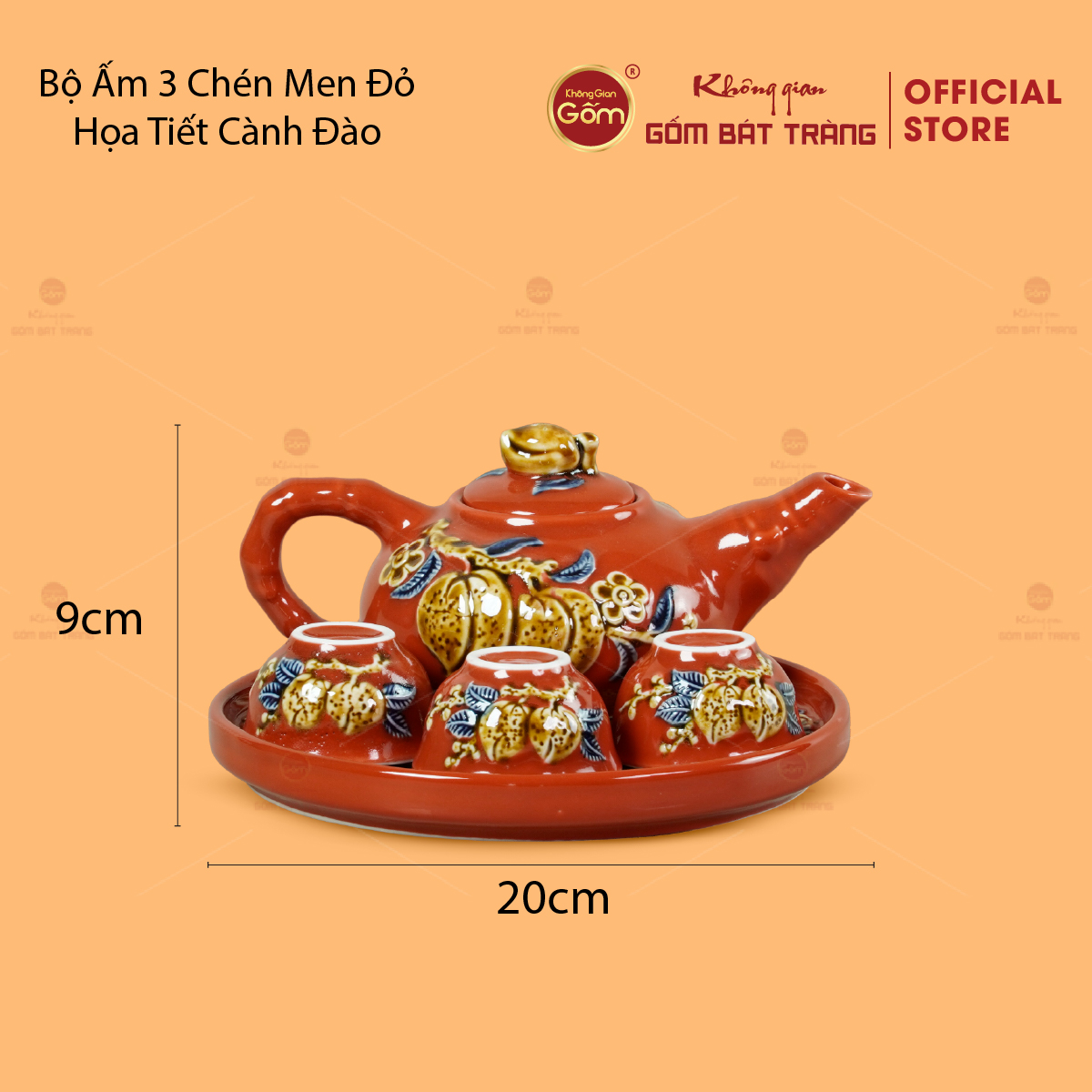 - Tên sản phẩm: Bộ Ấm 3 Chén Thờ Men Đỏ Họa Tiết Cành Đào