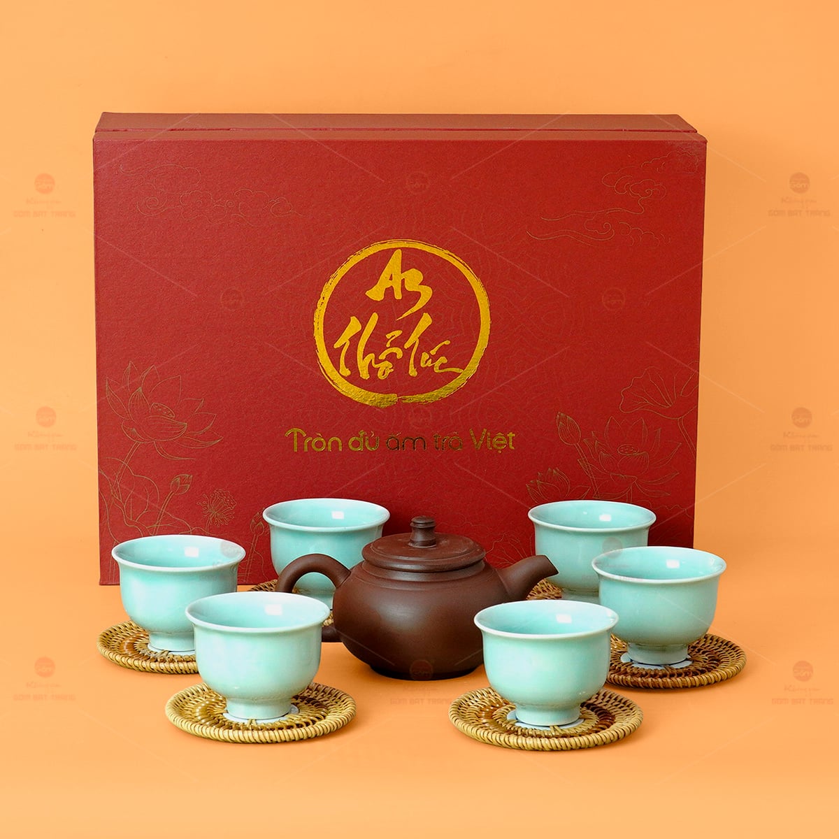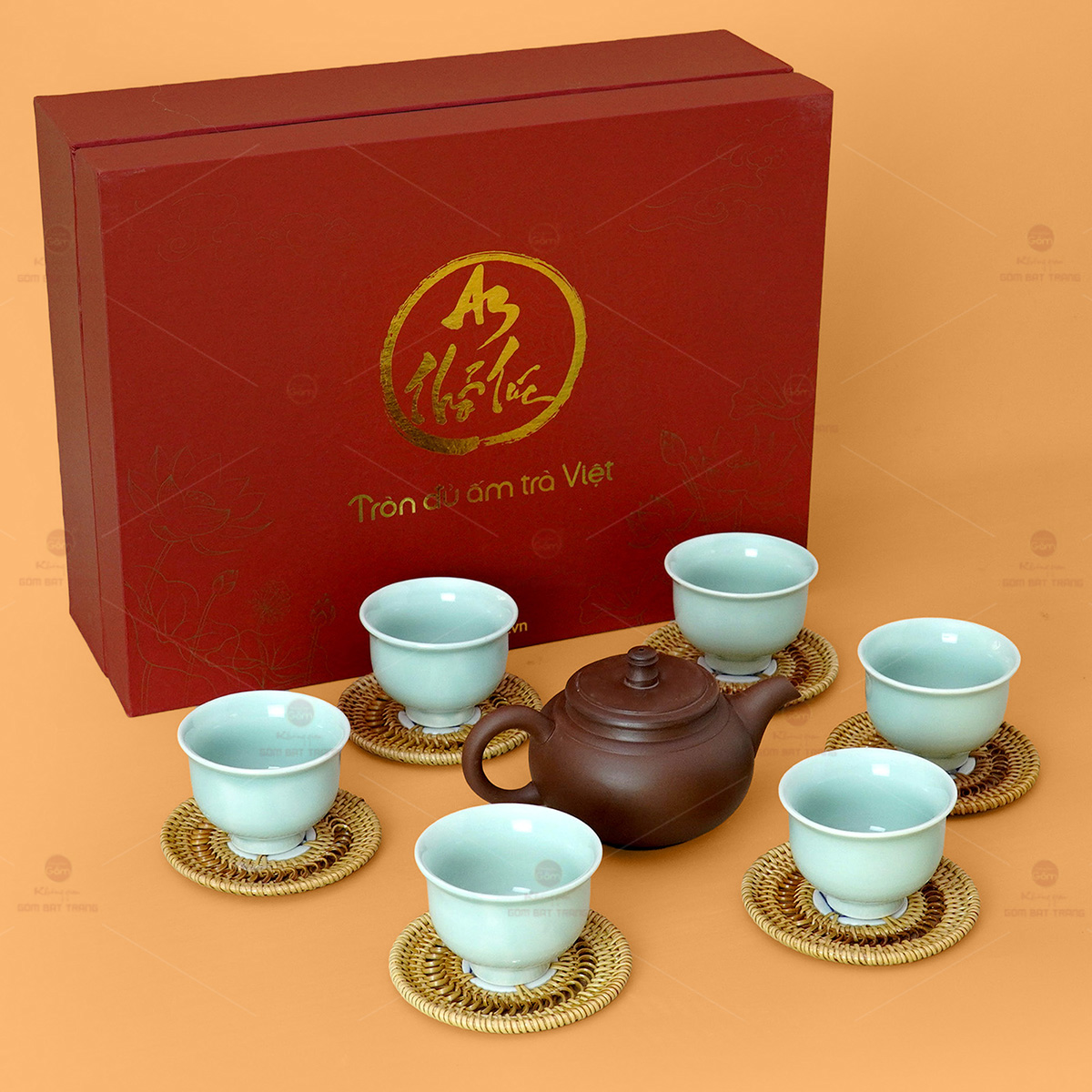 - Chi tiết các món: 1 ấm, 6 ly men tro, 6 lót mây, 1 hộp đựng