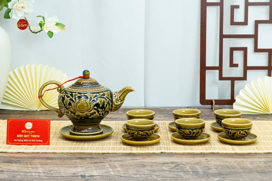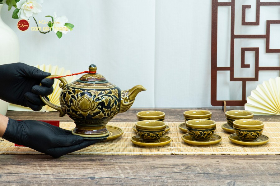 Bộ sản phẩm được chế tác thủ công tỉ mỉ bởi các nghệ nhân Bát Tràng. Chất liệu gốm sứ cao cấp, nung ở nhiệt độ trên 1200°C giúp sản phẩm có độ bền chắc, khả năng chịu nhiệt tốt và an toàn cho sức khỏe. Lớp men đen trầm ấm tạo chiều sâu sang trọng, kết hợp cùng hoa sen khắc nổi mang đến nét đẹp hài hòa giữa truyền thống và hiện đại.