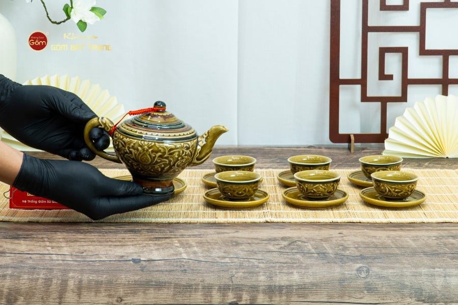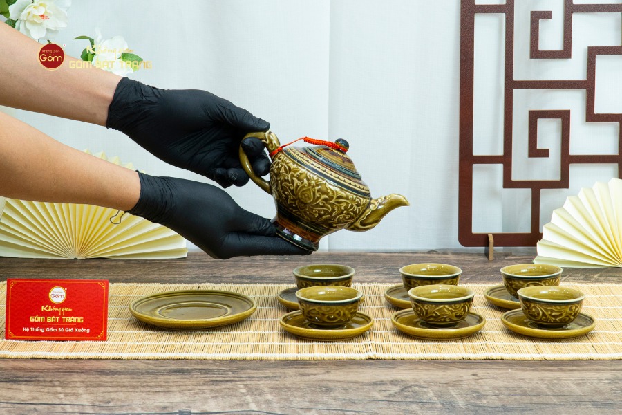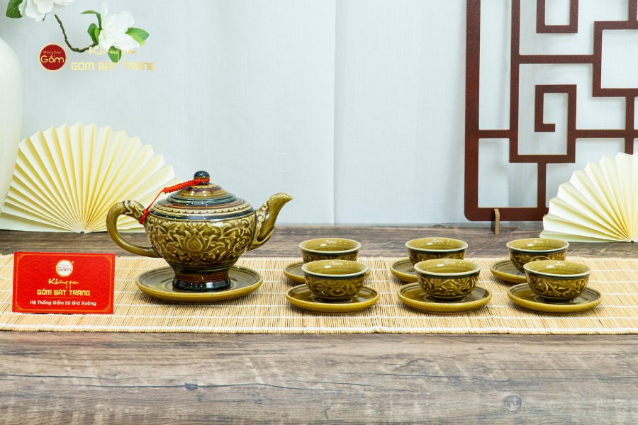 Trong nghệ thuật thưởng trà của người Việt, một bộ ấm chén đẹp không chỉ đơn thuần là dụng cụ pha trà, mà còn là biểu tượng của sự tinh tế, gu thẩm mỹ và phong cách sống của gia chủ. Bộ Ấm Chén Khắc Nổi Hoa Sen Nền Vàng chính là một trong những tác phẩm tiêu biểu của làng nghề gốm Bát Tràng, kết hợp hài hòa giữa vẻ đẹp thủ công truyền thống và giá trị thẩm mỹ hiện đại. Với gam màu vàng trầm ấm, sang trọng cùng họa tiết hoa sen khắc nổi tinh xảo, bộ ấm chén này toát lên sự quyền quý, thanh tao và đầy ý nghĩa phong thủy.