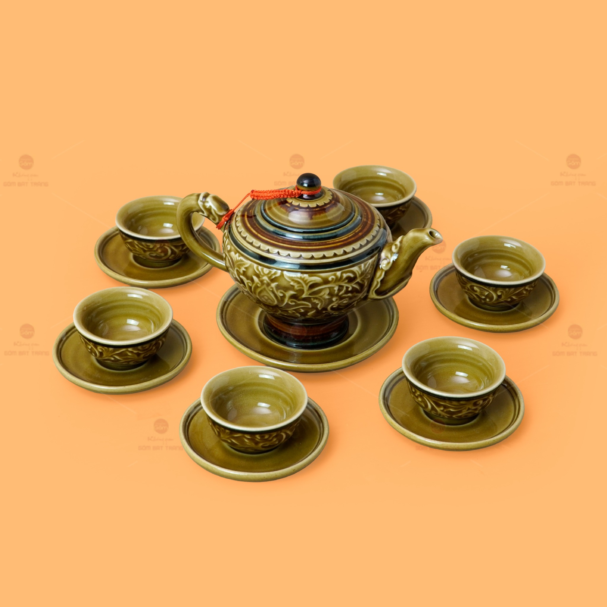 - Tên sản phẩm: Bộ Ấm Chén Khắc Nổi Hoa Sen Nền Vàng