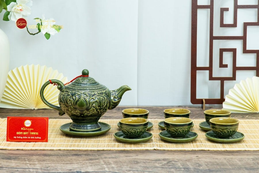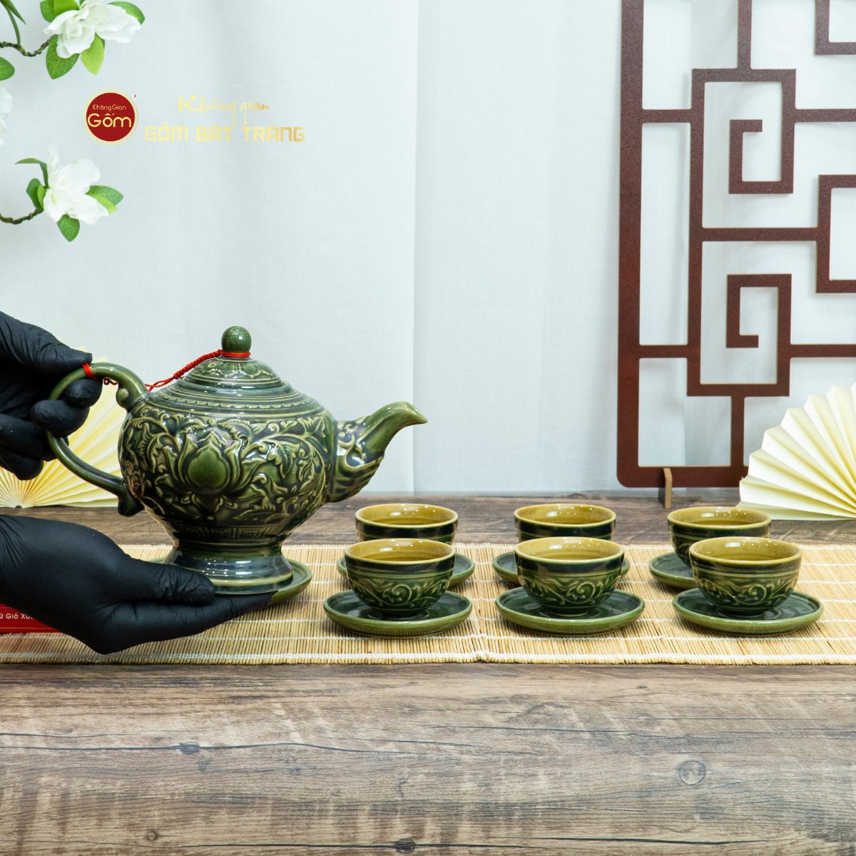 Bộ ấm chén được chế tác từ đất sét Bát Tràng cao cấp, nung ở nhiệt độ cao giúp sản phẩm bền chắc, an toàn cho sức khỏe và sử dụng lâu dài. Trên nền men xanh ngọc dịu nhẹ, họa tiết hoa sen được nghệ nhân khắc nổi thủ công vô cùng tỉ mỉ, tạo hiệu ứng chiều sâu và sự sống động khác biệt so với các sản phẩm vẽ tay thông thường.
