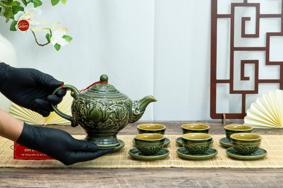 Trong văn hóa trà Việt, mỗi bộ ấm chén không chỉ mang giá trị sử dụng mà còn thể hiện phong cách sống và chiều sâu thẩm mỹ của người thưởng trà. Bộ Ấm Chén Khắc Nổi Hoa Sen Nền Xanh Ngọc là một tác phẩm gốm Bát Tràng tiêu biểu, nơi hội tụ tinh hoa thủ công truyền thống cùng vẻ đẹp thanh tao của hoa sen – loài hoa biểu trưng cho sự thuần khiết, cao quý và an nhiên trong tâm hồn người Việt.