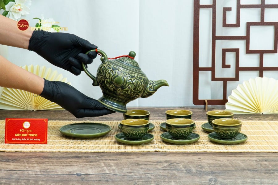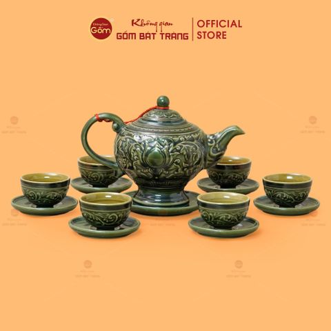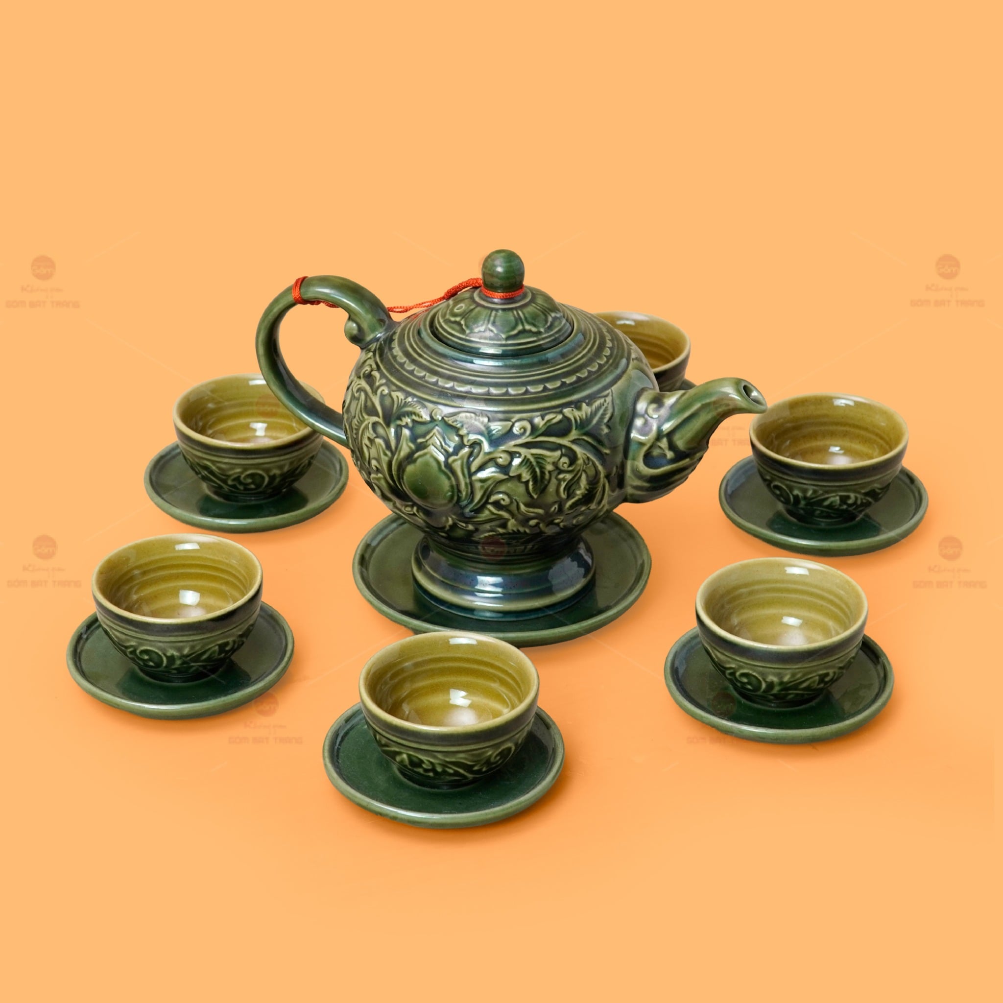 Màu xanh ngọc trong trẻo kết hợp cùng đường nét khắc nổi tinh xảo mang đến cảm giác vừa sang trọng, vừa gần gũi thiên nhiên. Bộ sản phẩm bao gồm ấm trà, chén uống và đĩa lót đồng bộ, kiểu dáng cân đối, gọn gàng, phù hợp để sử dụng trong gia đình hay không gian tiếp khách trang trọng.