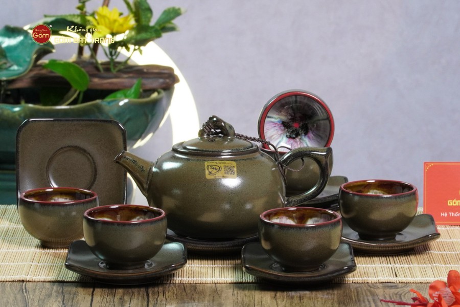 Công nghệ men hỏa biến độc đáo: Lớp men hỏa biến tạo hiệu ứng màu ngọc lấp lánh, kết hợp ánh hồng ở viền miệng chén và cổ ấm, tạo chiều sâu và sức hút thị giác đặc biệt. Mỗi sản phẩm đều có “một không hai” do màu men biến đổi tự nhiên dưới lửa nung.