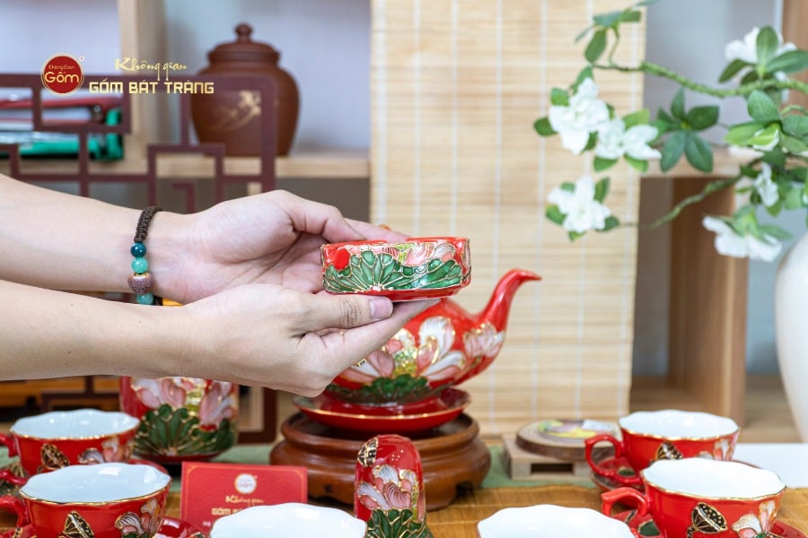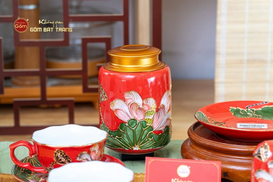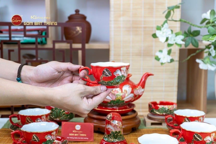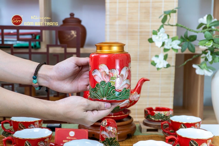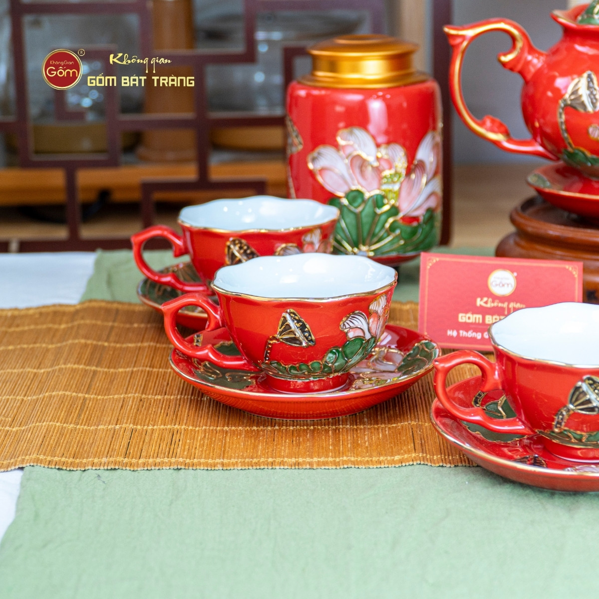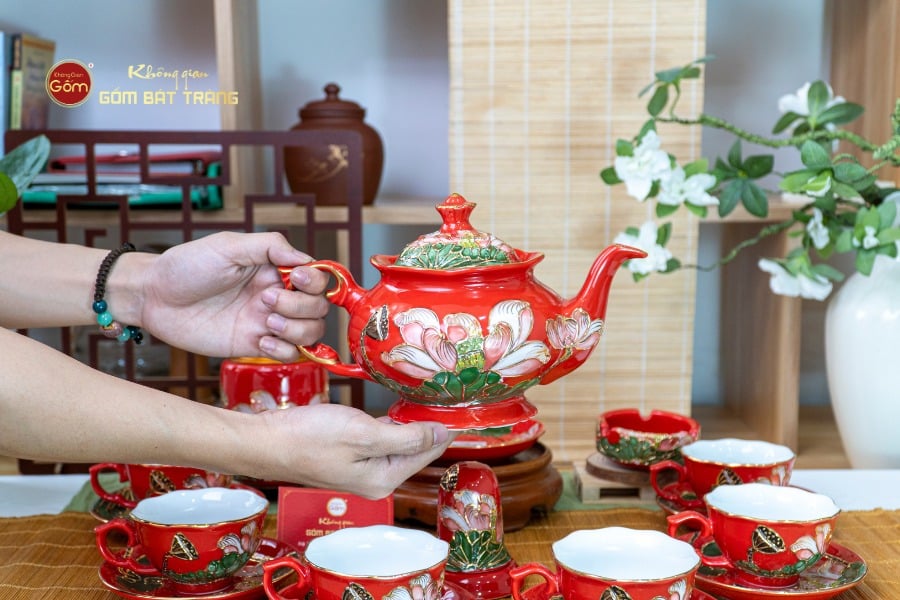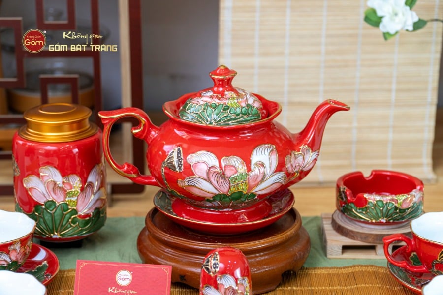 Điểm nổi bật của bộ sản phẩm nằm ở kỹ thuật đắp nổi hoa sen thủ công trên nền men đỏ rực rỡ. Từng cánh sen được tạo hình nổi khối rõ nét, mềm mại và có chiều sâu, giúp bề mặt gốm trở nên sống động và giàu giá trị nghệ thuật. Các chi tiết vẽ vàng được nhấn nhá tinh tế ở nhụy sen và hoa văn trang trí, tạo hiệu ứng ánh kim sang trọng, tôn lên vẻ cao cấp của toàn bộ sản phẩm.