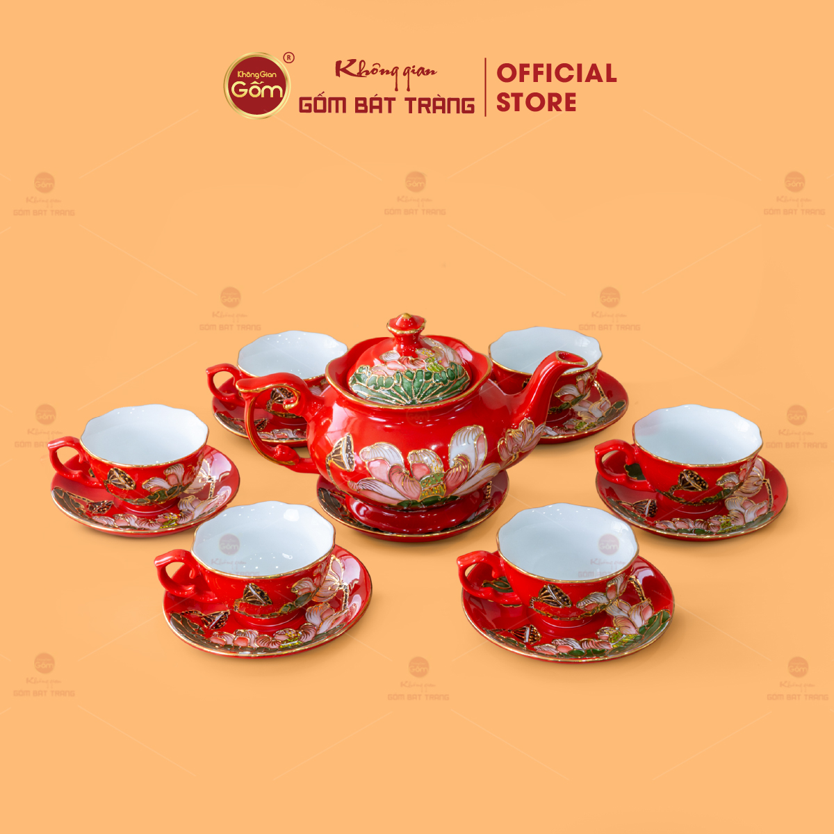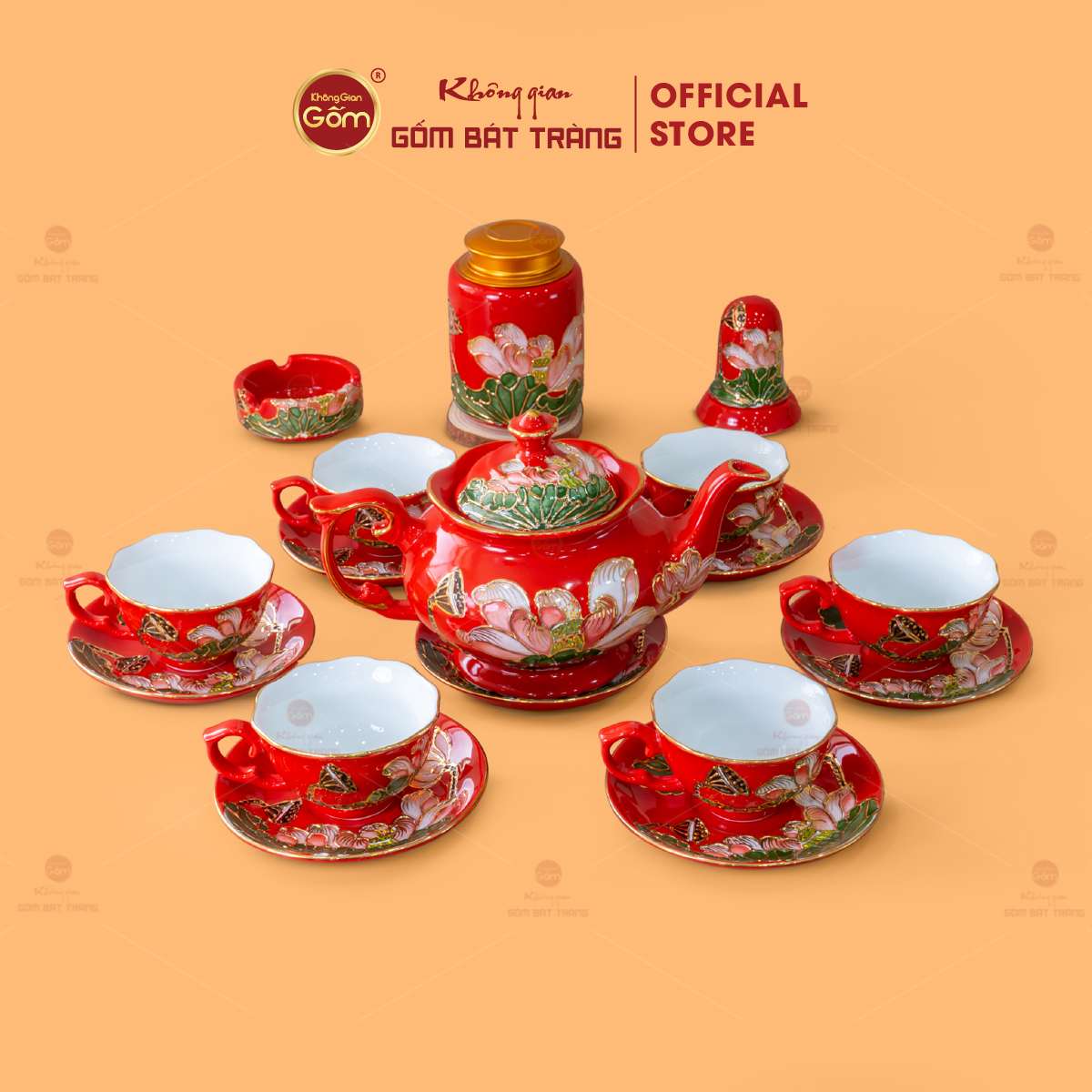 Địa chỉ mua Bộ Ấm Chén Queen Đỏ Hoa Sen Đắp Nổi Vẽ Vàng uy tín