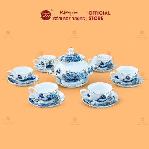 Sắc trắng tượng trưng cho sự sinh trưởng, tươi mới và năng lượng tích cực, kết hợp cùng ánh vàng biểu trưng cho phú quý và thịnh vượng. Sự hòa quyện giữa men xanh lam và vàng tạo nên nguồn năng lượng hài hòa, phù hợp để sử dụng trong không gian tiếp khách, phòng trà hoặc làm quà tặng mang ý nghĩa chúc phúc. Bộ ấm chén không chỉ phục vụ nhu cầu thưởng trà mà còn thể hiện phong thái sống tinh tế, trân trọng giá trị truyền thống và sự an nhiên trong tâm hồn.