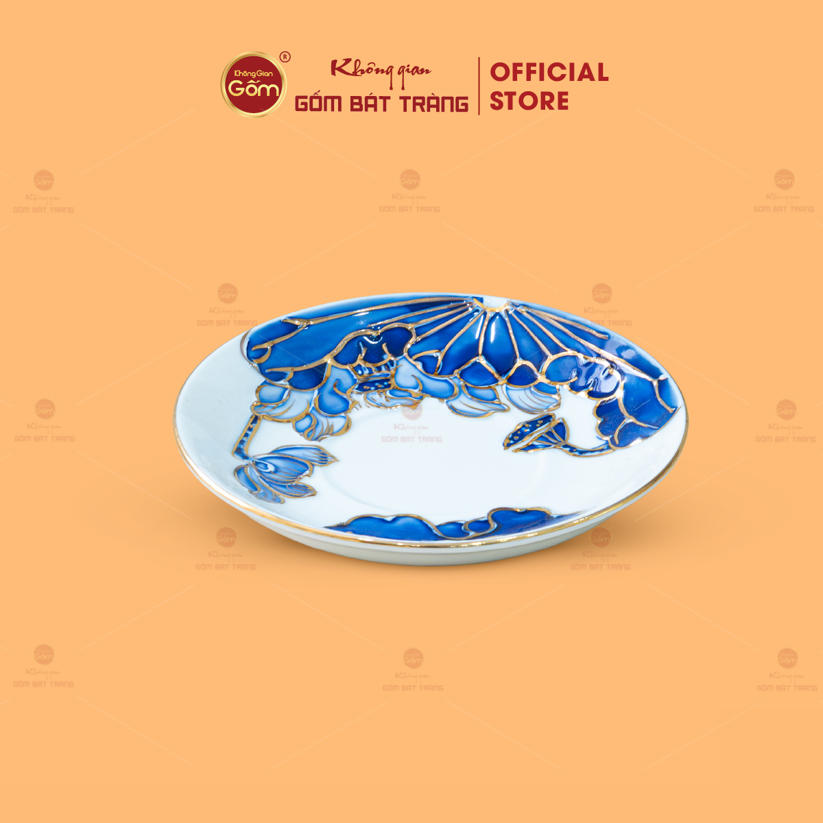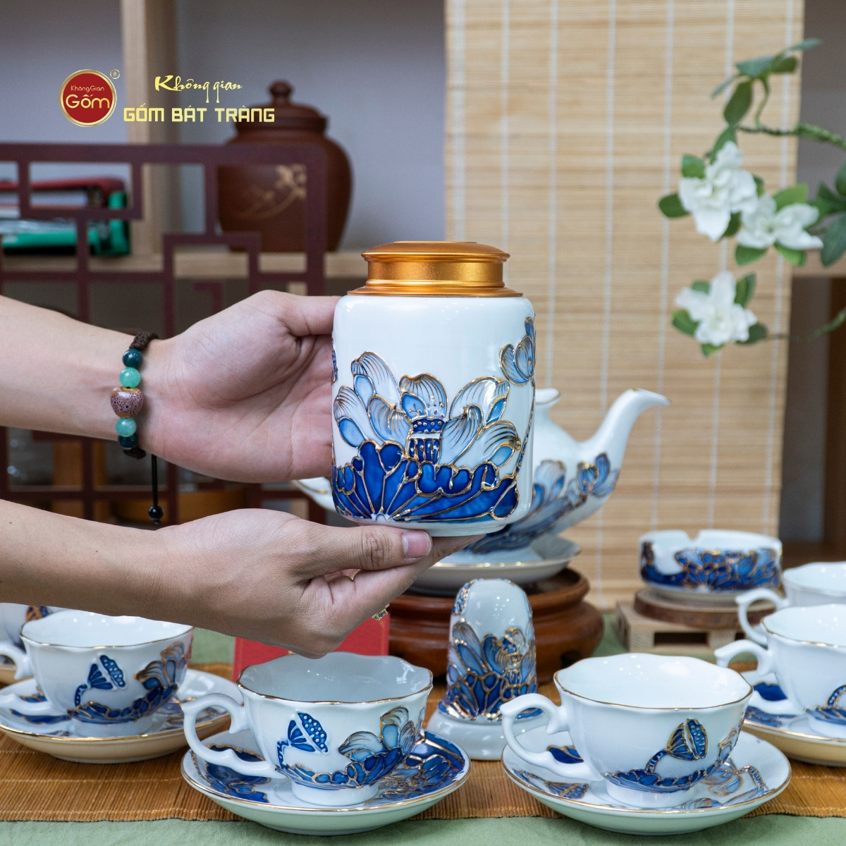 Điểm nổi bật của bộ ấm chén nằm ở kỹ thuật đắp nổi hoa sen hoàn toàn thủ công, tạo chiều sâu và hiệu ứng thị giác sinh động trên bề mặt gốm. Từng cánh sen mềm mại, uyển chuyển, nổi bật trên nền men xanh lam trầm ấm, mang lại cảm giác sang trọng và khác biệt so với các dòng ấm chén vẽ phẳng thông thường. Các chi tiết vẽ vàng được thực hiện tỉ mỉ ở nhụy sen và viền hoa văn, giúp tổng thể thêm phần tinh xảo, bắt sáng tốt và nâng cao giá trị thẩm mỹ.