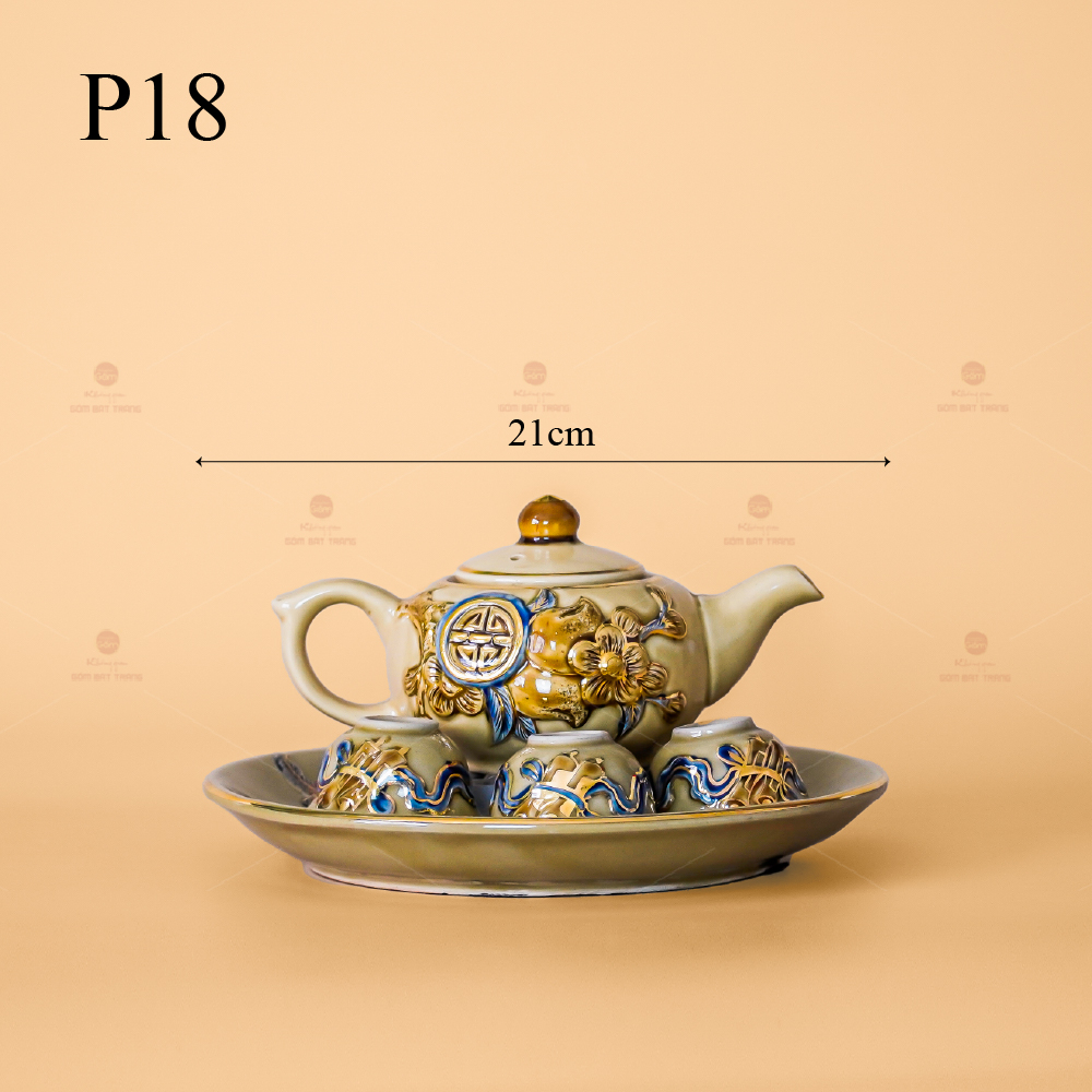 Nền men sang trọng làm nổi bật nét đẹp riêng kết hợp với thiết kế tinh tế với quai cầm vừa tay và sự chắc chắn trong kết cấu đảm bảo độ bền lâu dài của sản phẩm. Điểm nổi bật của bộ ấm chén là họa tiết hoa sen được tinh tế vẽ vàng trên mọi chi tiết của ấm, đĩa và chén trà. Sự tinh tế trong từng đường nét và chi tiết tạo ấn tượng mạnh mẽ với mọi góc nhìn.