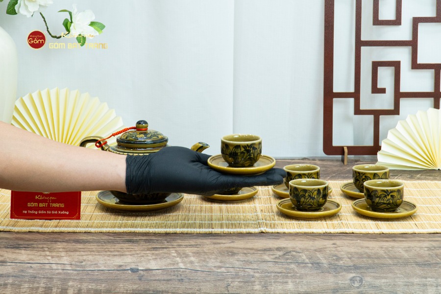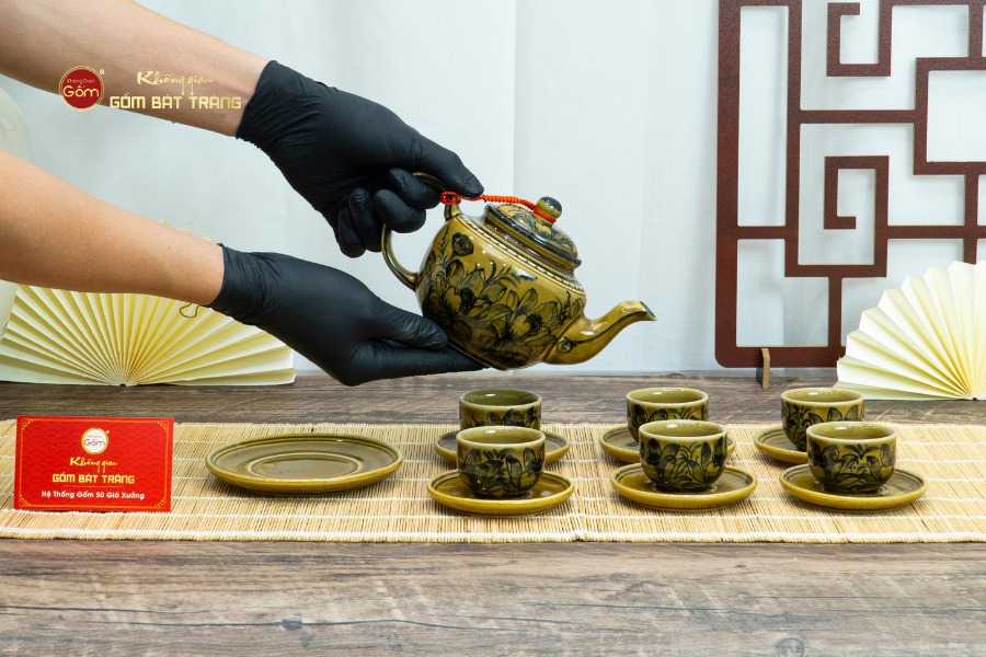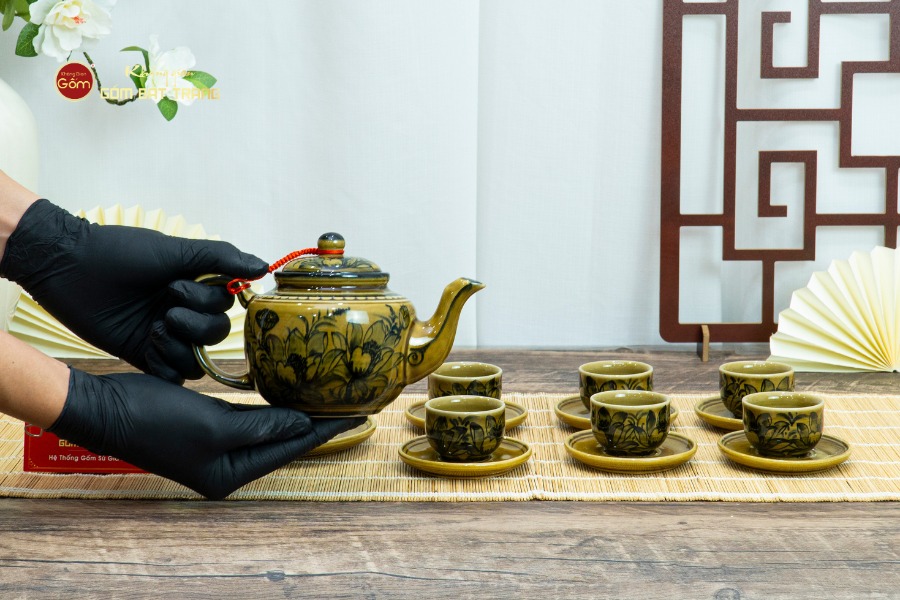 Bộ ấm chén được chế tác từ nguồn đất sét tinh luyện đặc trưng của Bát Tràng, loại đất đã được tuyển chọn kỹ càng và xử lý theo quy trình truyền thống lâu đời. Trải qua quá trình tạo hình thủ công và nung ở nhiệt độ trên 1.200 độ C, sản phẩm đạt đến độ bền chắc cao, khả năng chịu nhiệt tốt và tuyệt đối an toàn cho sức khỏe người dùng.