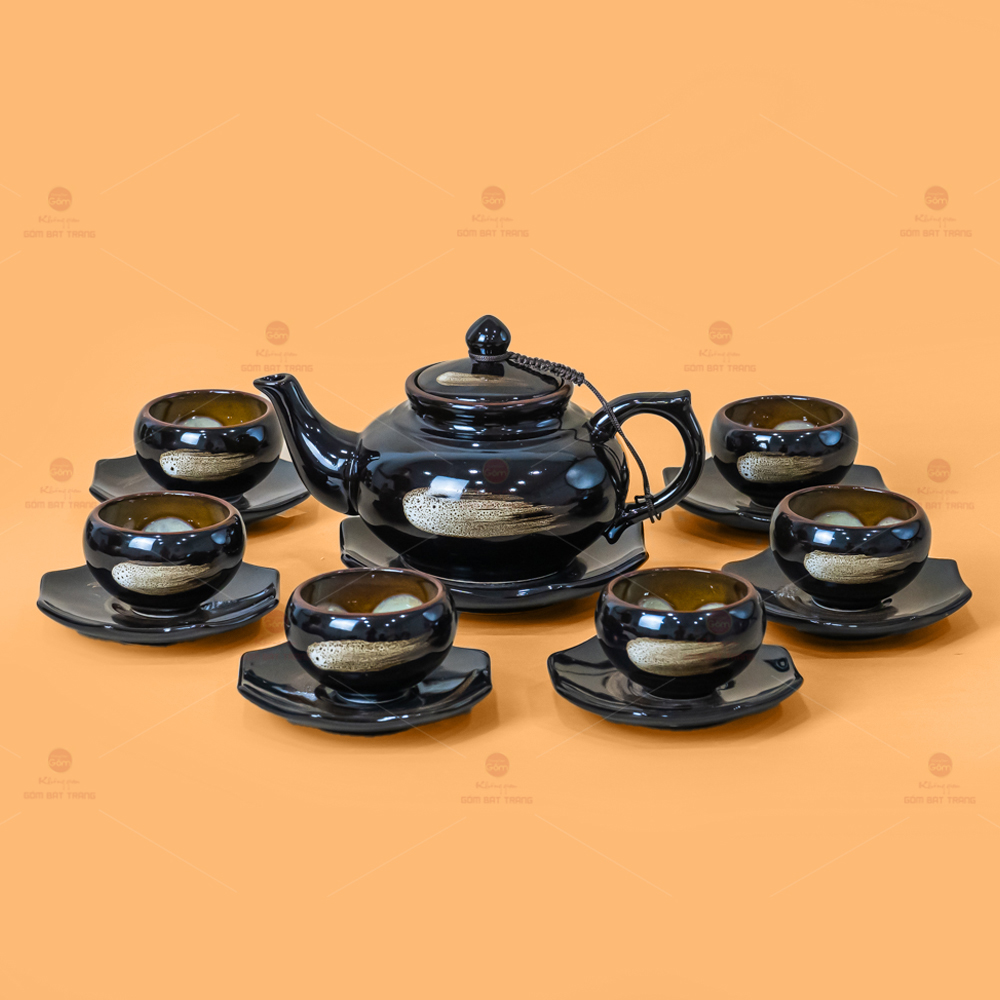 Bộ Ấm Trà Thiên Nga Xước Hoa Men Hỏa Biến với ấm trà có kích thước vừa vặn đủ cho một tuần trà, với 6 chén trà có dung tích vô cùng phù hợp. Quai ấm to, tròn, chắc tay. Bên trong lòng chén trà với họa tiết cánh hoa vẽ tay vô cùng tinh xảo, bên ngoài là lớp men hỏa biến có màu men đen và họa tiết xước hoa màu vàng làm điểm nhấn vô cùng bắt mắt. Màu sắc đặc biệt này được hình thành do nhiệt độ cao từ quá trình nung chín sản phẩm. Đây chính là nét độc đáo tạo nên tính nghệ thuật khi chế tác sản phẩm men hỏa biến. Nước men hỏa biến thay đổi màu sắc tùy theo nhiệt độ nung cùng với kỹ thuật pha màu men của người nghệ nhân. Cũng chính vì lý do này mà các sản phẩm gốm sứ Bát Tràng thường mang nét độc bản mà không sản phẩm nào có được.