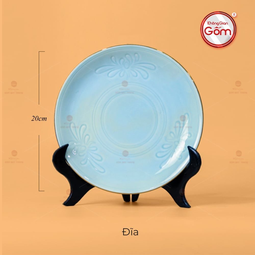 Điểm nhấn nghệ thuật của bộ bàn ăn này chính là họa tiết hoa cúc được dập nổi một cách tinh xảo trên từng sản phẩm, kết hợp với các đường kẻ vàng sang trọng.. Hoa cúc, loài hoa biểu tượng cho sự trường thọ, phúc lộc và khí chất thanh cao, được tái hiện một cách mềm mại, uyển chuyển.. Những đường vân nổi không chỉ tăng tính thẩm mỹ mà còn tạo cảm giác chắc chắn khi cầm nắm. Ngoài ra, viền vàng được kẻ thủ công ở mép đĩa và miệng bát, tạo nên một sự tương phản tuyệt vời với màu men ngọc, mang lại vẻ đẹp sang trọng và đẳng cấp cho toàn bộ sản phẩm.. Sự kết hợp này mang đến vẻ đẹp vừa cổ điển, vừa hiện đại, phù hợp với mọi không gian nội thất, đặc biệt là những không gian sang trọng và có phong cách truyền thống.