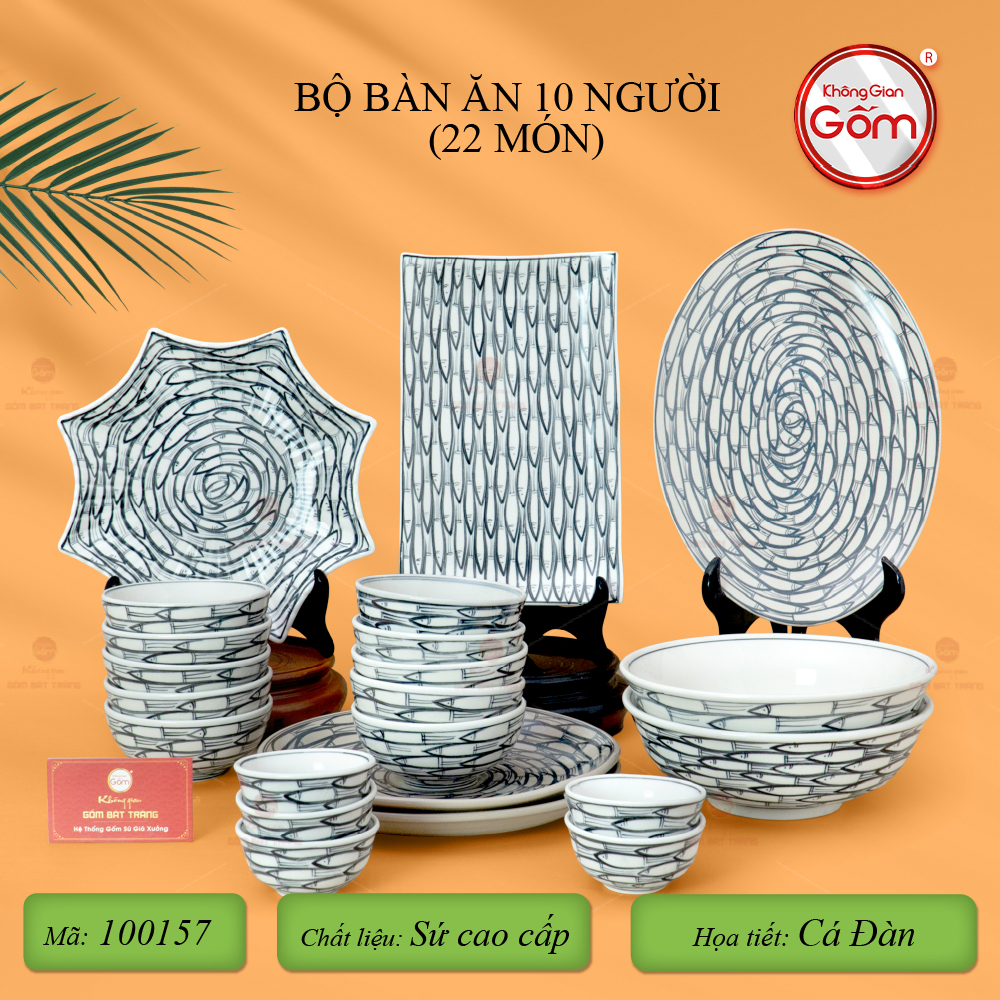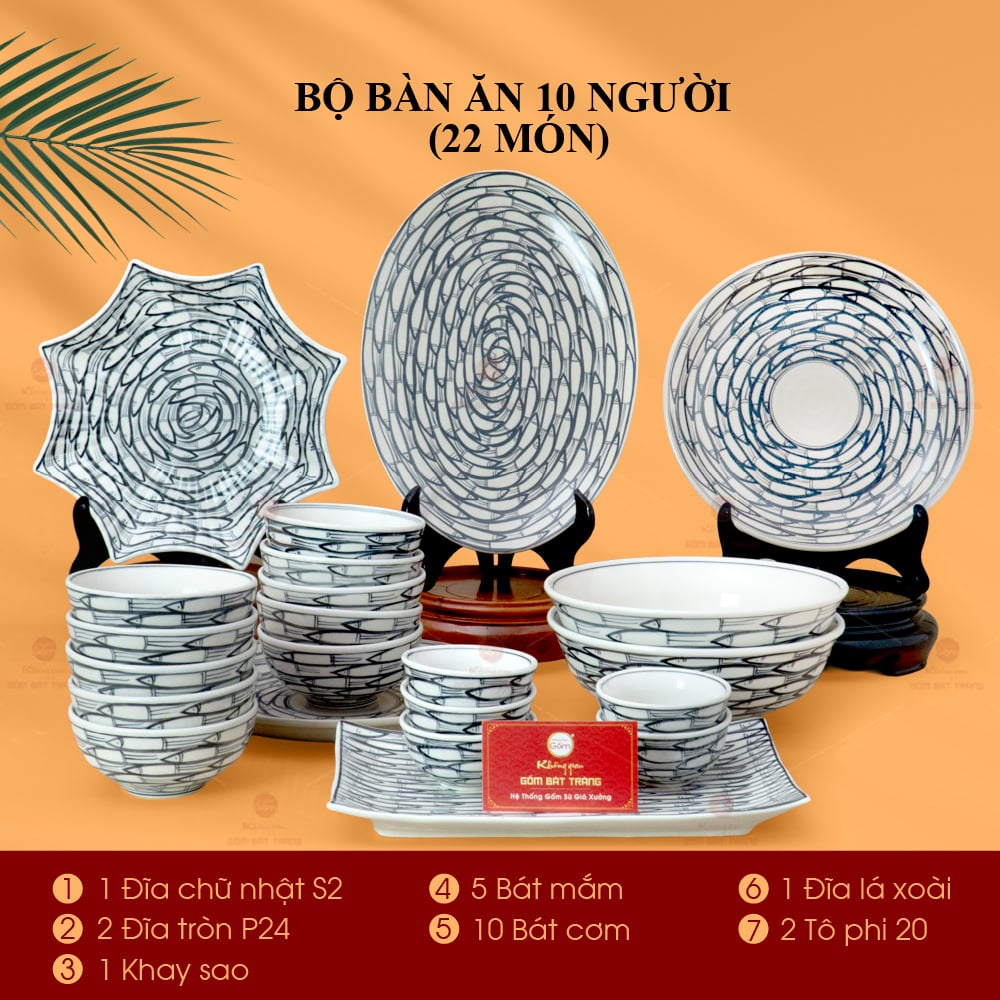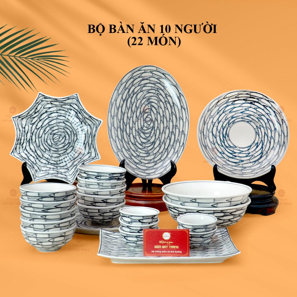 - Tên sản phẩm: Bộ Bàn Ăn 10 Người (22 món) Men Trắng Vẽ Cá Đàn