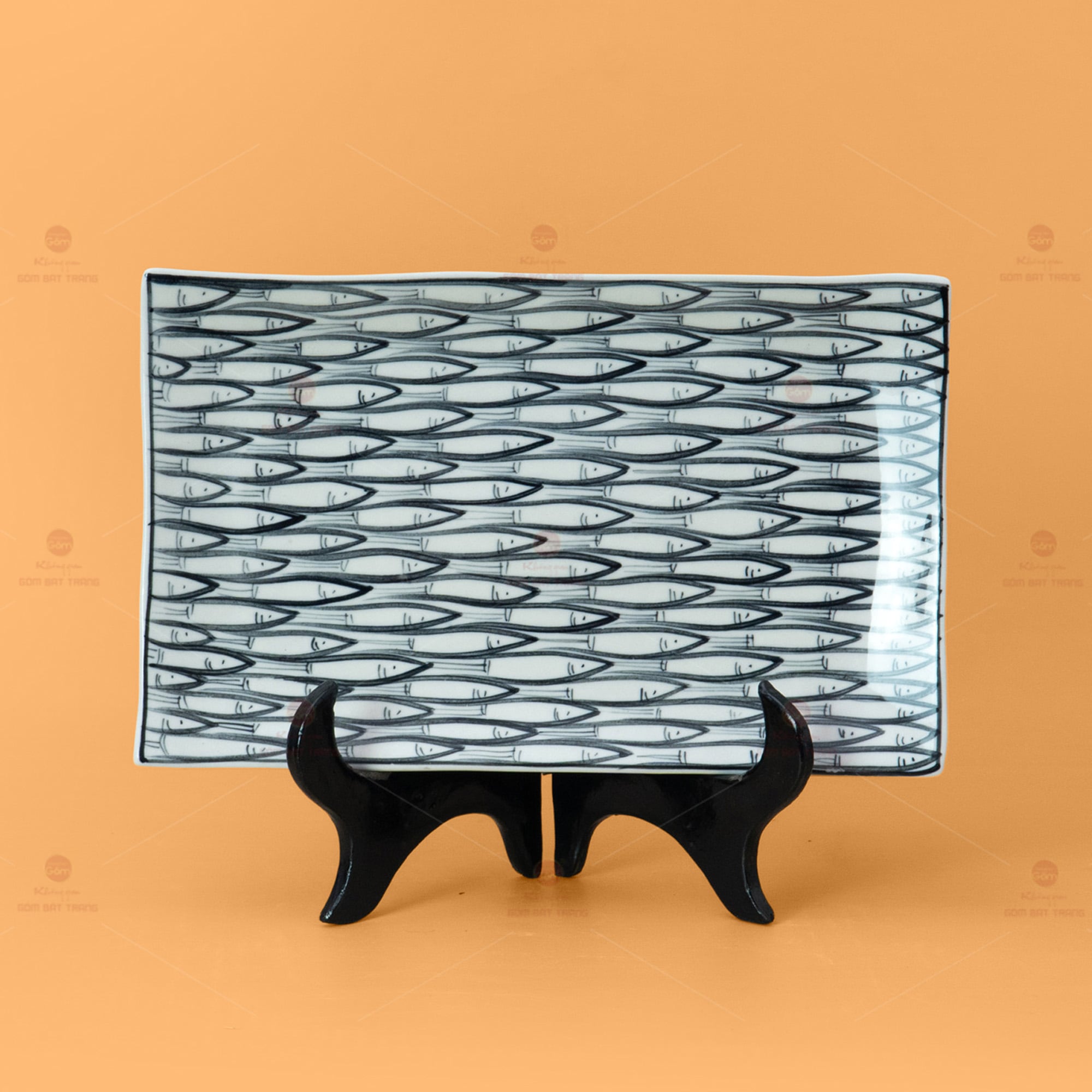 Trên đĩa chữ nhật: Họa tiết được sắp xếp theo hàng dọc, tạo nên một cái nhìn lạ mắt và hiện đại..