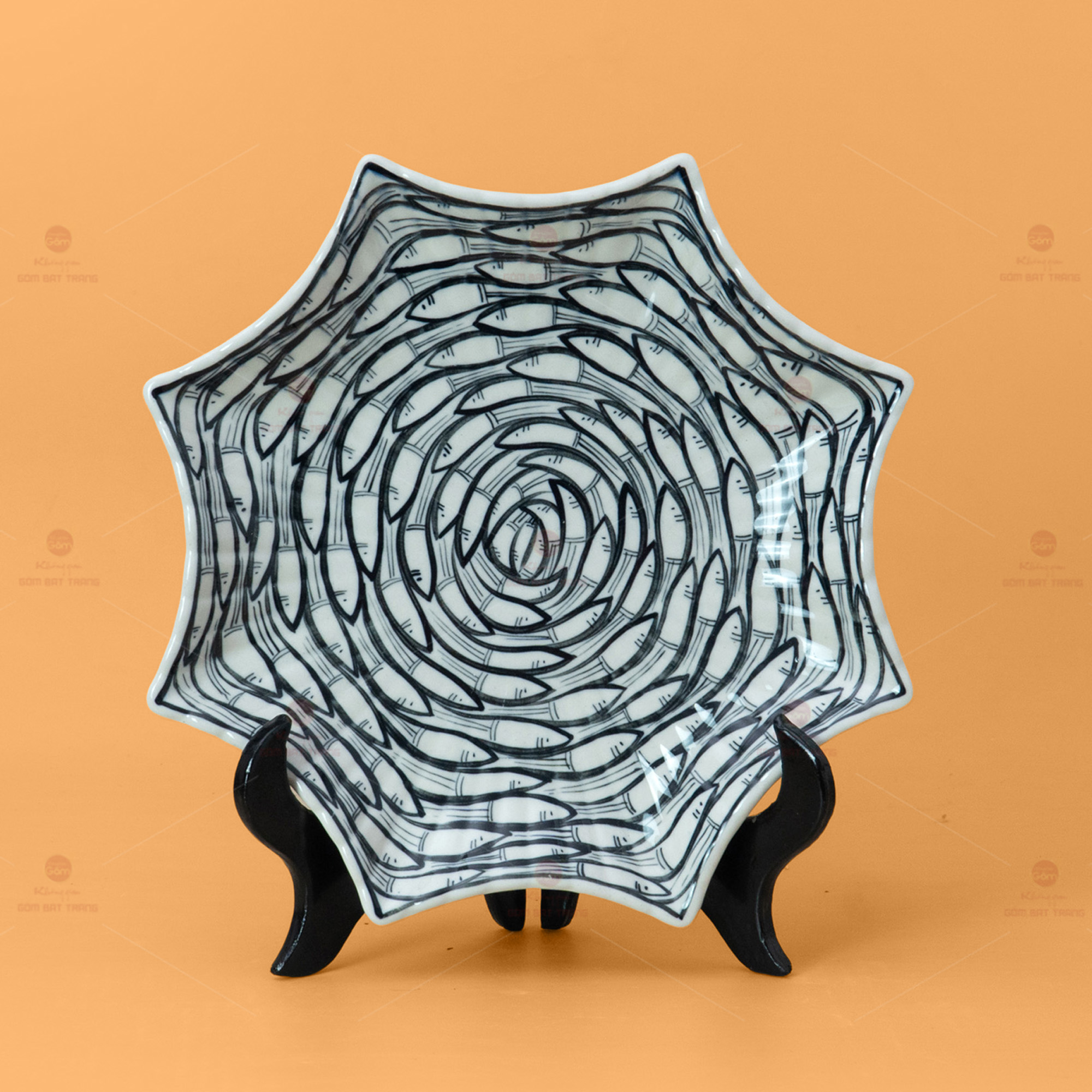 Trên đĩa tròn lớn: Họa tiết cá được sắp xếp theo hình xoắn ốc đồng tâm, tạo hiệu ứng thị giác mạnh mẽ, hút mắt người nhìn.. Đây là một biến thể độc đáo của họa tiết cá đàn, tượng trưng cho sự luân chuyển, tuần hoàn của tài lộc và may mắn.